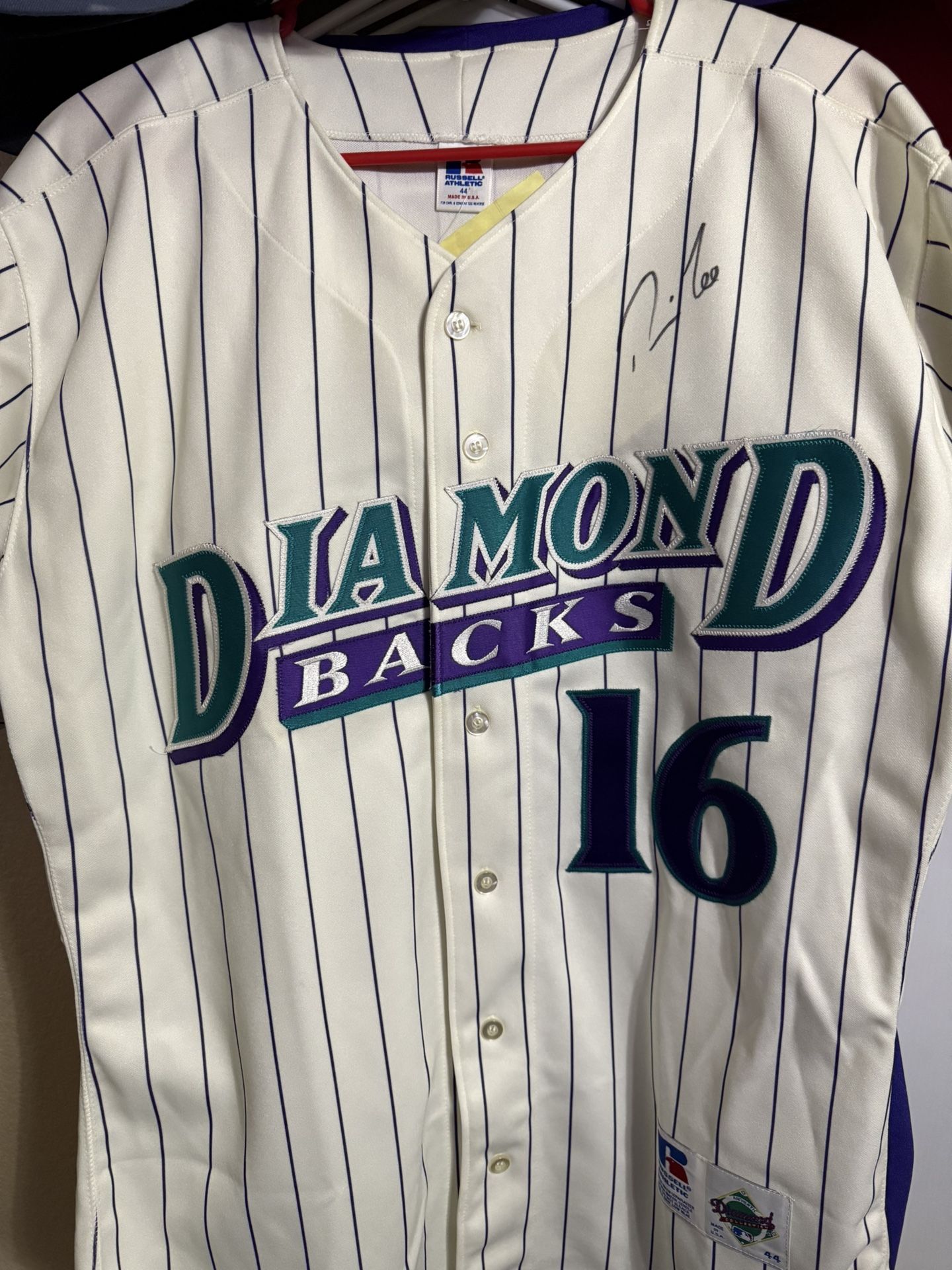 Vintage Arizona Diamondbacks white pinstripe home jersey by Russell Athletic, size 44, made in USA. Features fully stitched team name and #16 in teal, purple, and white — the iconic late-’90s Diamondbacks look. Autographed on the chest by Travis Lee, one of the franchise’s original players. Excellent condition — crisp fabric, vibrant colors, and authentic Russell Diamond Collection tag. 🧢 Details: – Team: Arizona Diamondbacks – Player: Travis Lee #16 – Brand: Russell Athletic (Diamond Collection) – Size: 44 – Made in USA – Autographed – Great vintage collectible for fans and jersey collectors alike 💵 Asking $195 OBO, open to reasonable offers. Local pickup or shipping available.
