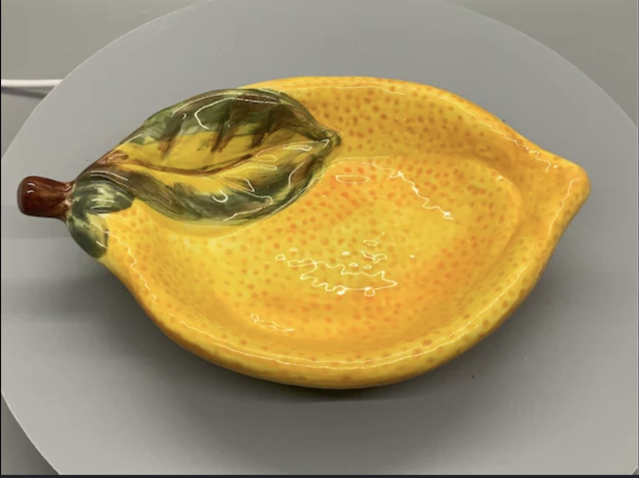 These adorable set of 4 Lemon Hand Painted Olive Oil Dipping Bowls from Tabletops Gallery are perfect for spring, use as EVOO dipping bowls, sauce or dressing bowls, small serving bowls for fruit, nuts or other healthy treats. Very good used condition. See photos for condition. Measurements of Each: Height: 1 inch Width: 3 3/4 inches Length: 5 1/2 inches Weight: 5 oz