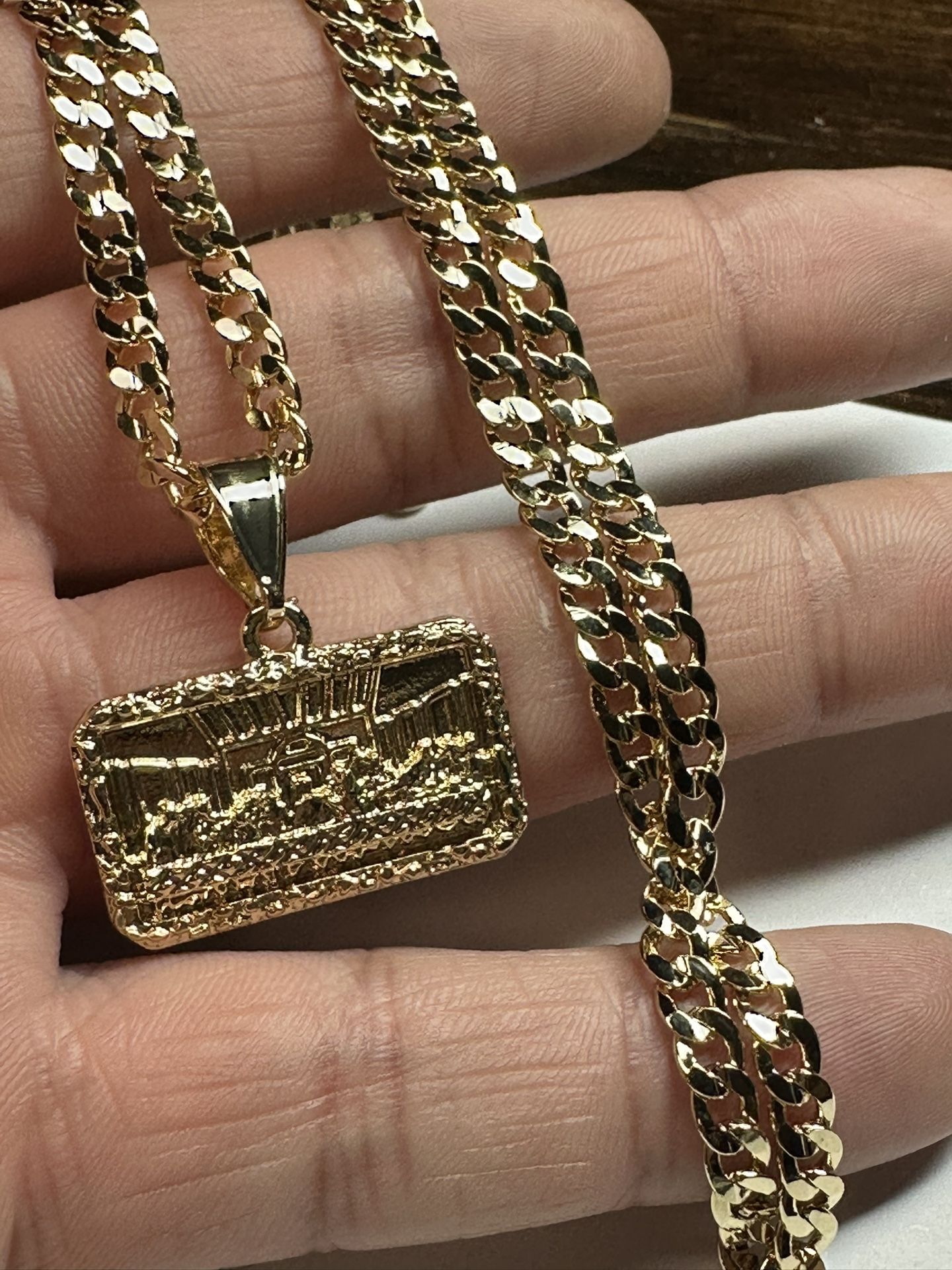 Brand New Never Worn 14k PVD Plated Last Supper Piece for sale with chain 3.5 mm " thickness for chain PVD Plate 22" long Pendant is 25.4mm (1 inch) wide 15mm tall. About 1 inch tall with bail. $70 for set Can drop off within reasonable distance. Thank you for looking