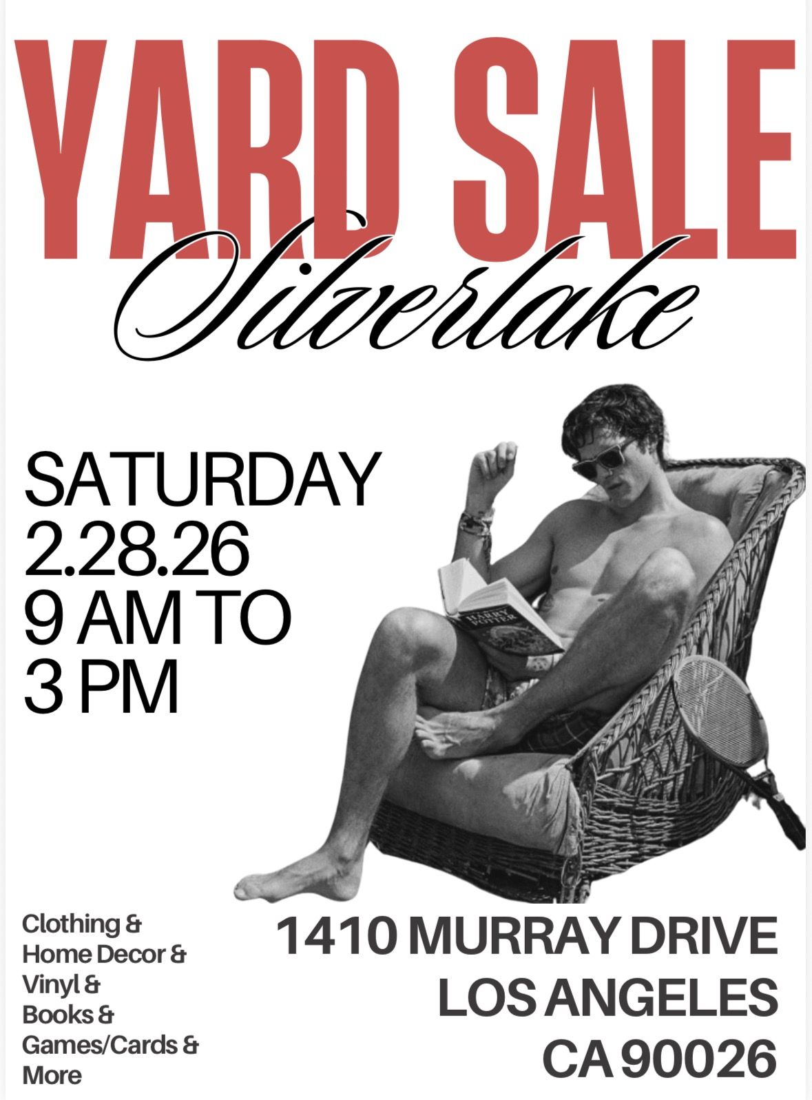 Multi Family yard sale at the top of the hill in Silverlake. Street parking can be tricky, sometimes easier to park on sunset (near 3237 Sunset Blvd) and walk up the Piano Stairs. We will be selling tons of clothing, home decor, vinyl, books, board games, baseball cards, and more. Sat 2/28 Start time: 9am 1410 Murray Dr Los Angeles, CA 90026