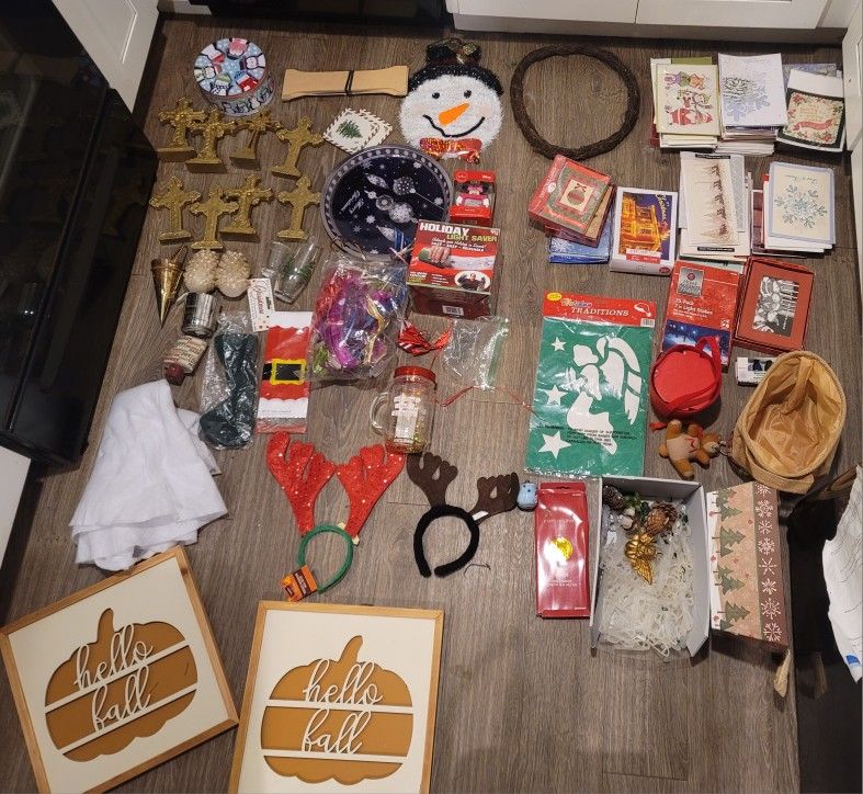 Over 60 Christmas decorations/items($20 for all) there is tons of Christmas cards all different, Headbands, decorations, Icicle tinsel, crosses, cups, candy bags, wreath, some Ornaments, night light and so much more