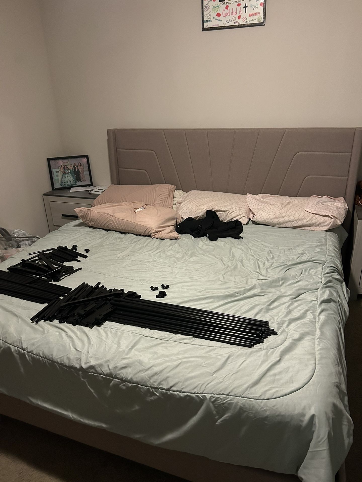 King size bedroom set, less than a year old, moving states, NEED GONE ASAP!! $1200 OBO 2 nightstands, dresser, mirror(not pictured because I never installed it sitting behind the dresser), and bed frame, can include mattress or not.
