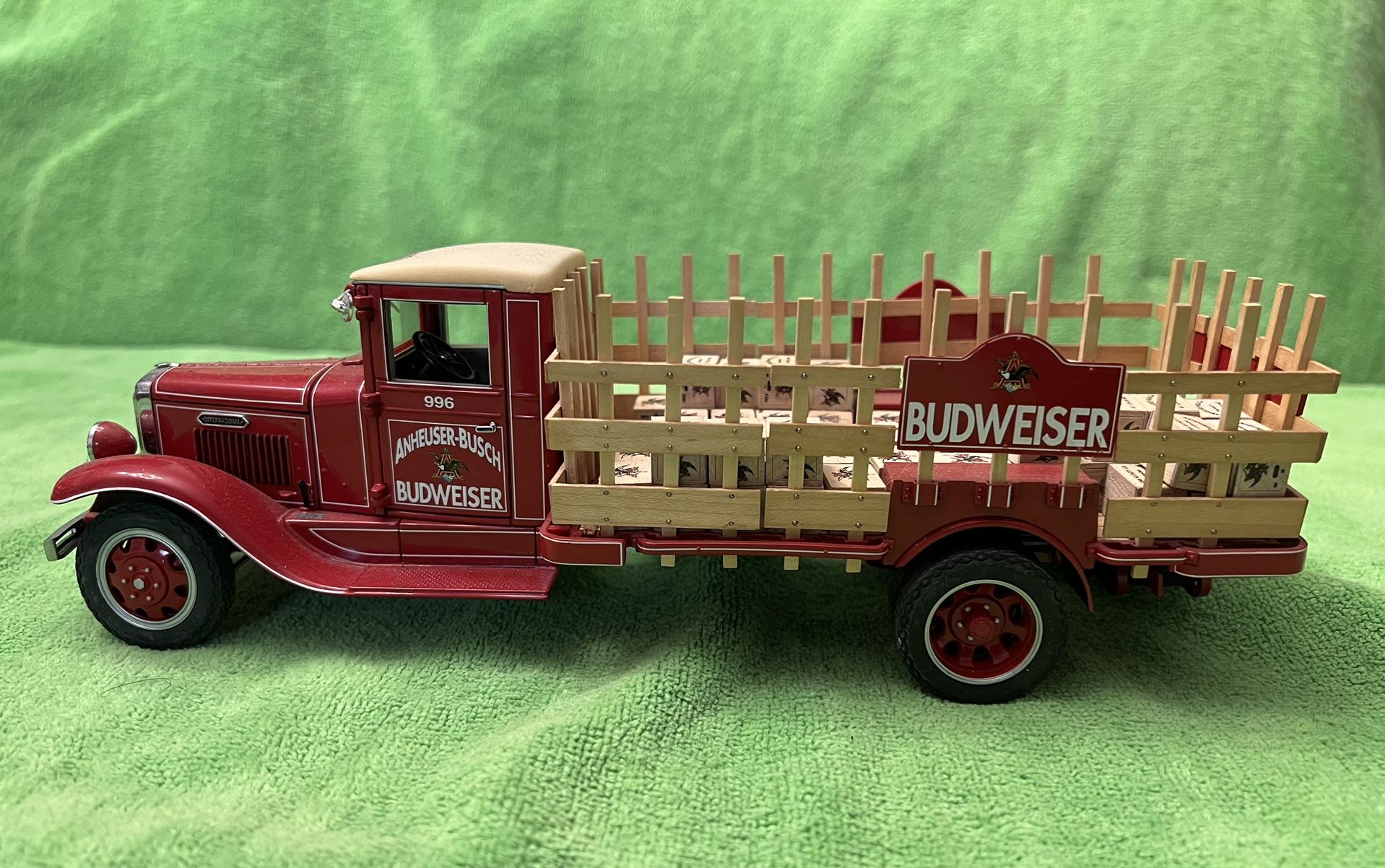 Pre Owned Tamiya Danbury Mint 1933 Budweiser Diecast Delivery Truck in glossy Red with cargo. “This is a 1933 Budweiser Delivery Truck. It was meticulously manufactured by The Danbury Mint are this company's model vehicles are characterized by outstanding workmanship and detail. This is true both for the engine, interior, under-body and the trunk. The instrument panel is complete. The door handles are located in the door trim for just as they were on the original truck. The paint is glossy and distinct.” It measures approximately 10” from front to back. The delivery bed is about 6” X 3.75” Please review all photos as they are part of the description.