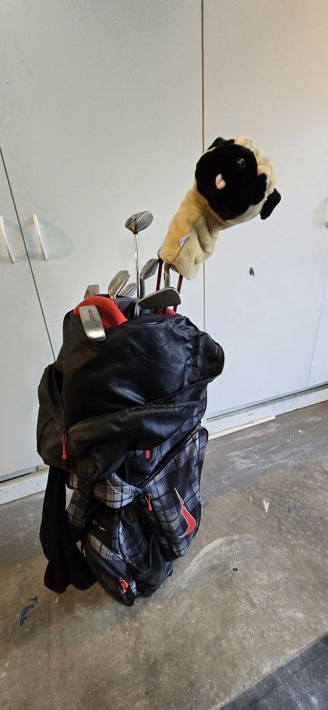 Older set of Cobra Baffler Blade irons (3, 4, 6, 7, 8, 9, P), and Callaway driver/hybrids (D, 3, 20 degree) with Nike bag.