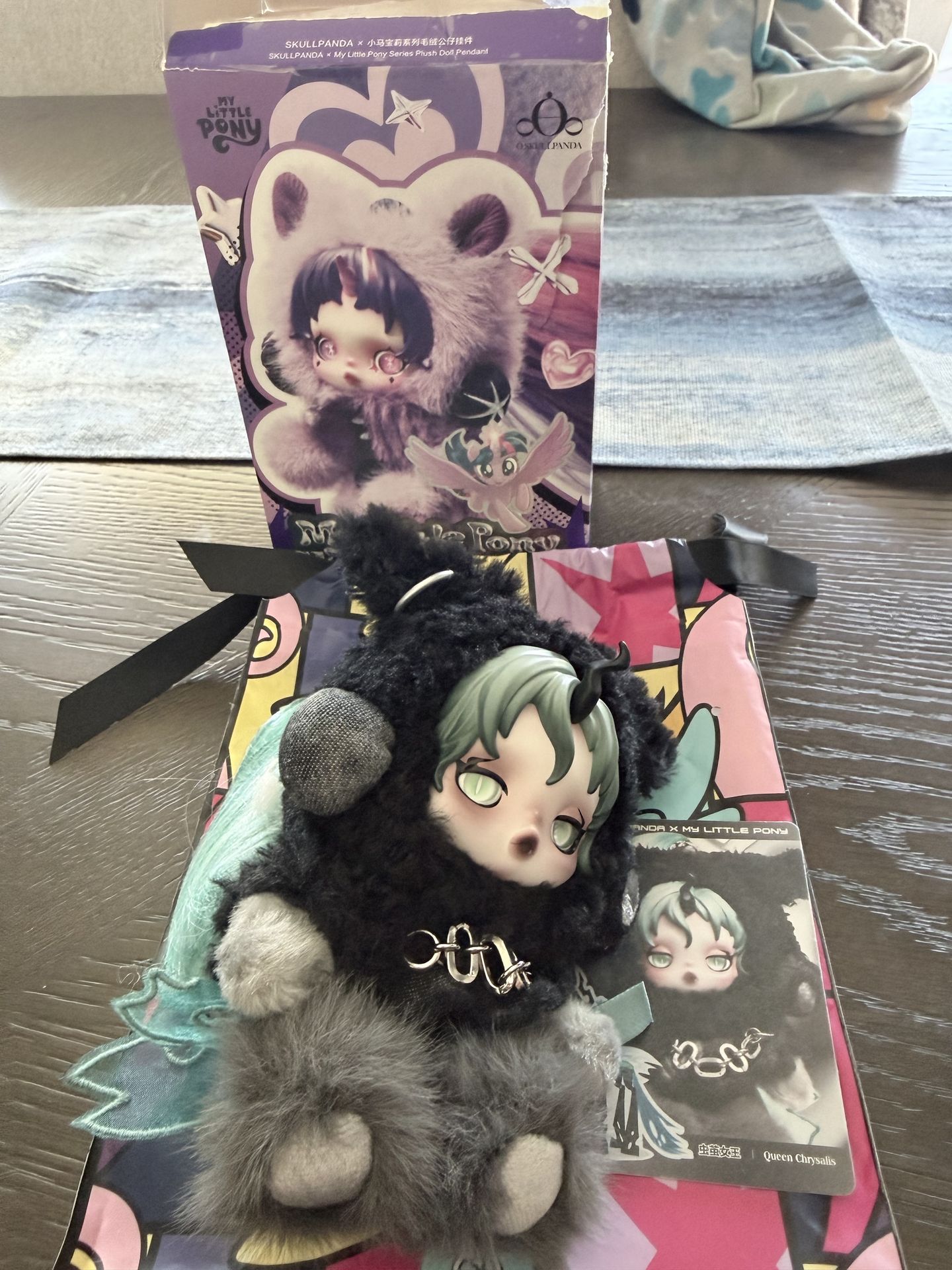 POP MART Skullpanda x My Little Pony Series Plush Doll Pendant Character: Queen Chrysalis PRICE IS FIRM Authentic – verified through Pop Mart anti-counterfeit QR system Includes original box, character card, and packaging Opened only to confirm character From the Skullpanda x My Little Pony collaboration series Condition: Box opened carefully for identification. It’s in excellent condition. Box has opening wear and slight rip on front (see photos). Great piece for Pop Mart / Skullpanda collectors or My Little Pony fans. Local meet up only or pick up Riverside Ca