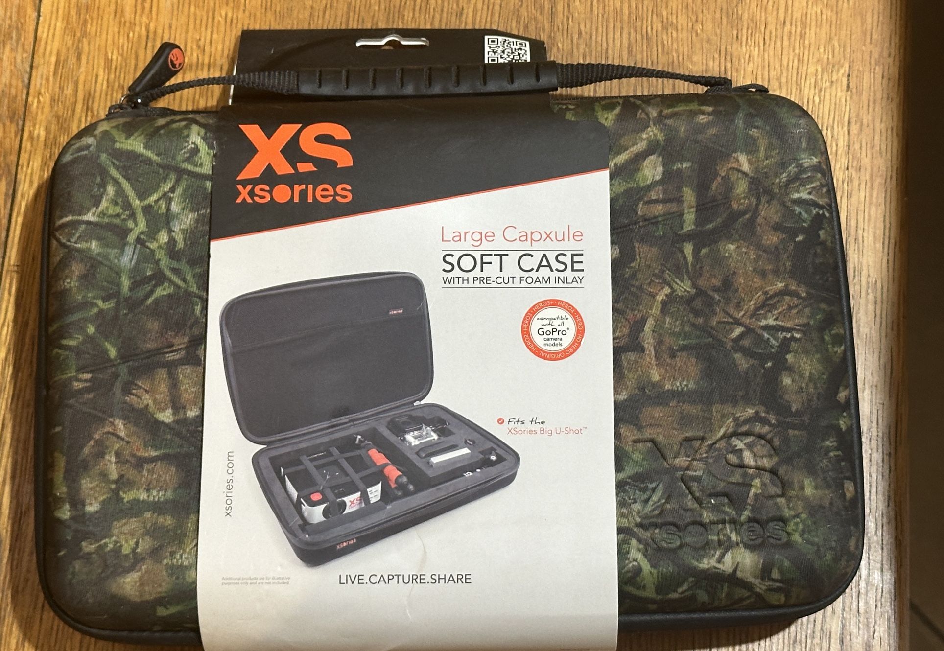XSories products, The Large Capxule Soft Case with Pre-Cut Foam for GoPro Cameras. Black color design. Features: - Fits all GoPro HERO camera housings, Wi-Fi remote, SD cards, and XSories Big U-Shot - Removable/adjustable elastic web plate for additional storage - Internal mesh pocket stores loose wires and other accessories - Includes carabiner and carrying handle for easy transportation