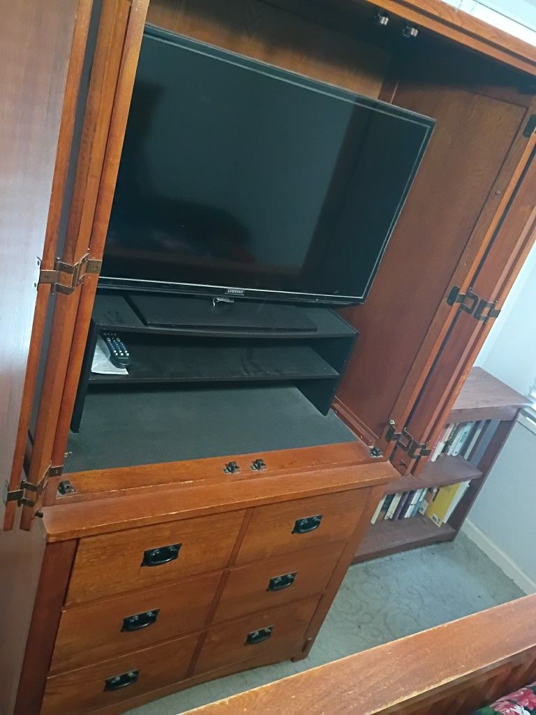 Mission style television cabinet with 3 drawers to hold your clothing. In good condition. TV NOT INCLUDED