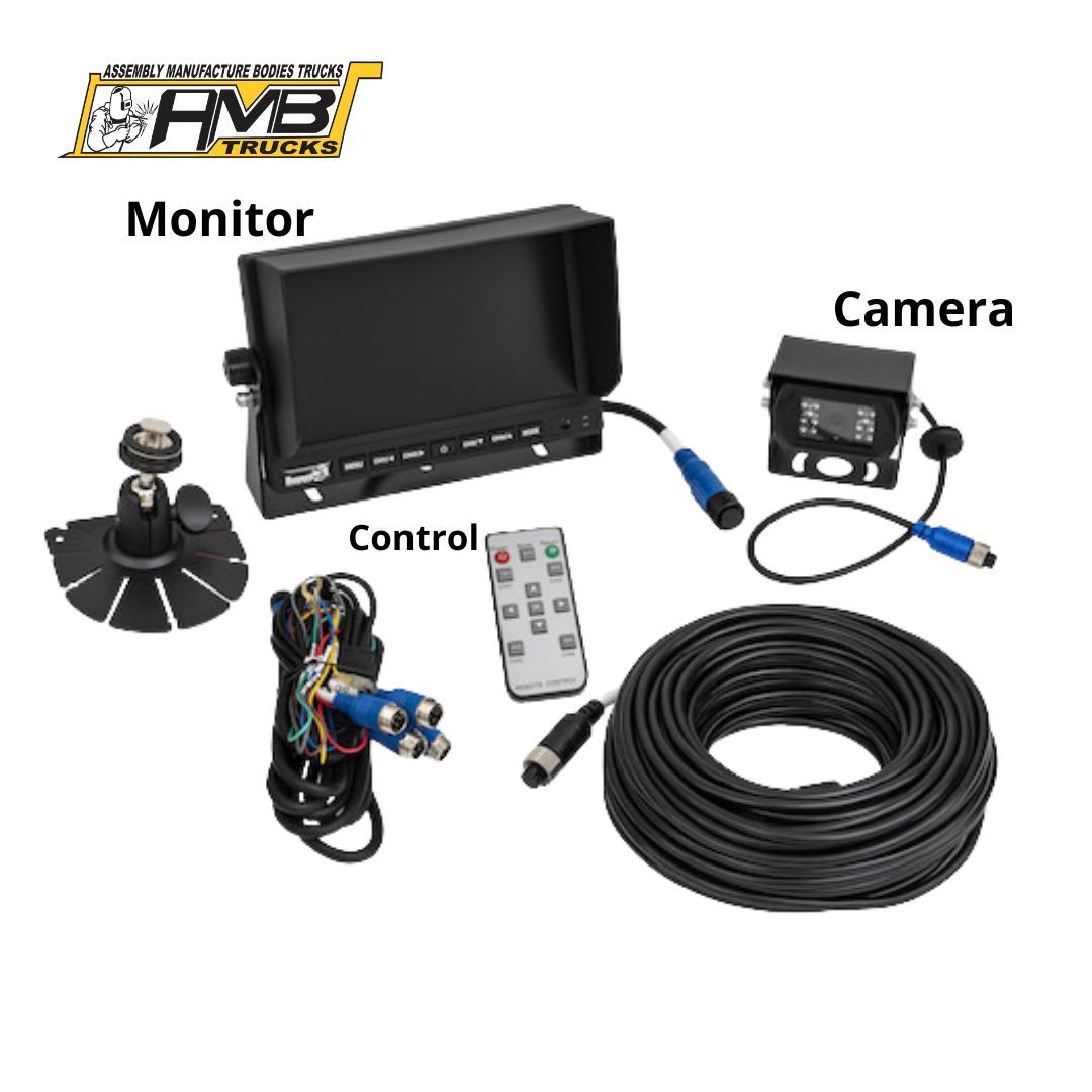 Improve rear-view visibility and obstacle detection with our night vision backup camera with audio. Includes a 128GB SD card for digital video recording (compatible up to 256GB), and automatically powers on when the vehicle shifts into reverse. Its versatile full-color monitor offers multiple mounting options and supports up to four cameras simultaneously (additional cameras sold separately). Wireless remote control included. AMB Trucks is an authorized distributor of this system, backed by a two-year warranty. Installation not included. Visit us at www.ambtrucks.com or call 305 640 9901 / 954 673 1455 for more information.