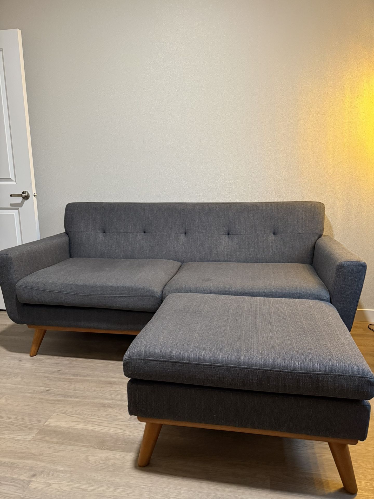 Mid Century Modern sofa and ottoman. Ive had these for a few years and have taken very good care of them. Non smoking home, but we do have a cat, although she didn’t scratch the fabric or tear anything. See photos for dimensions and descriptions. Only selling together, local pickup only. Price is negotiable, but the couch is in great shape, so no lowball offers pls. Located in Milwaukie.