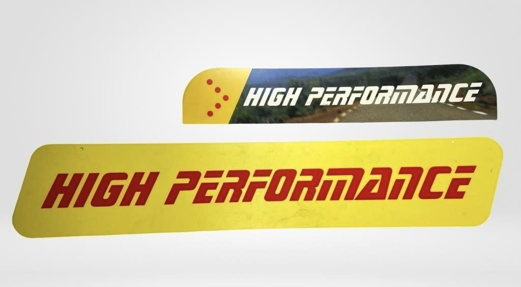 Two "High Performance" Advertisement double sided Signs. 65" x 12" & 43" x 8". Good Condition.