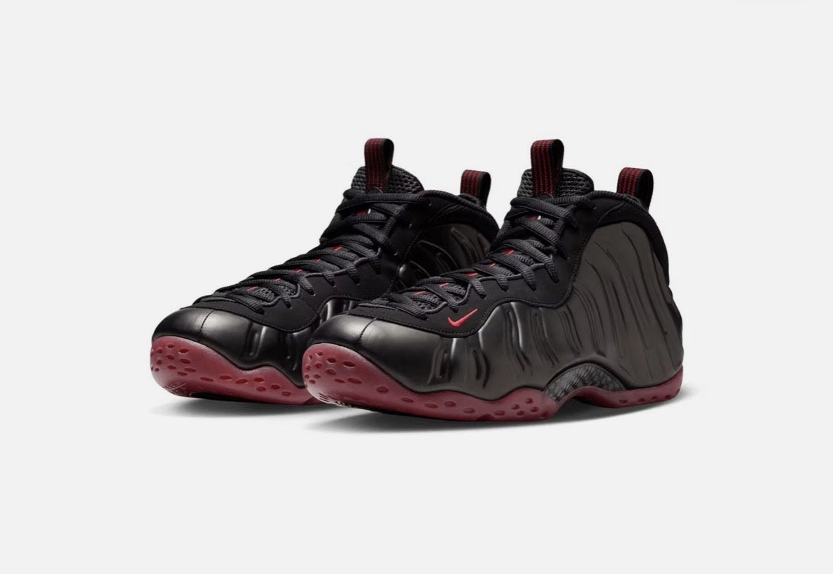 The shoe in the image is the Nike Air Foamposite One "Cough Drop". This iconic sneaker features a futuristic, liquid-like design in a Black and Varsity Red colorway. No box. Upper: A molded Foamposite upper that adapts to the foot for a glove-like fit. Cushioning: Equipped with full-length Nike Zoom Air units for lightweight, responsive comfort. Branding: Includes the signature "1 Cent" logo on the heel and tongue, representing Penny Hardaway's legacy. Support: Features a carbon fiber shank for added stability. Outsole: A rubber outsole with a herringbone tread pattern for durability and traction. Buying Information This model has been released multiple times, including a 2007 version and a more recent 2025 re-release. Retail Price: Typically around $240-$875