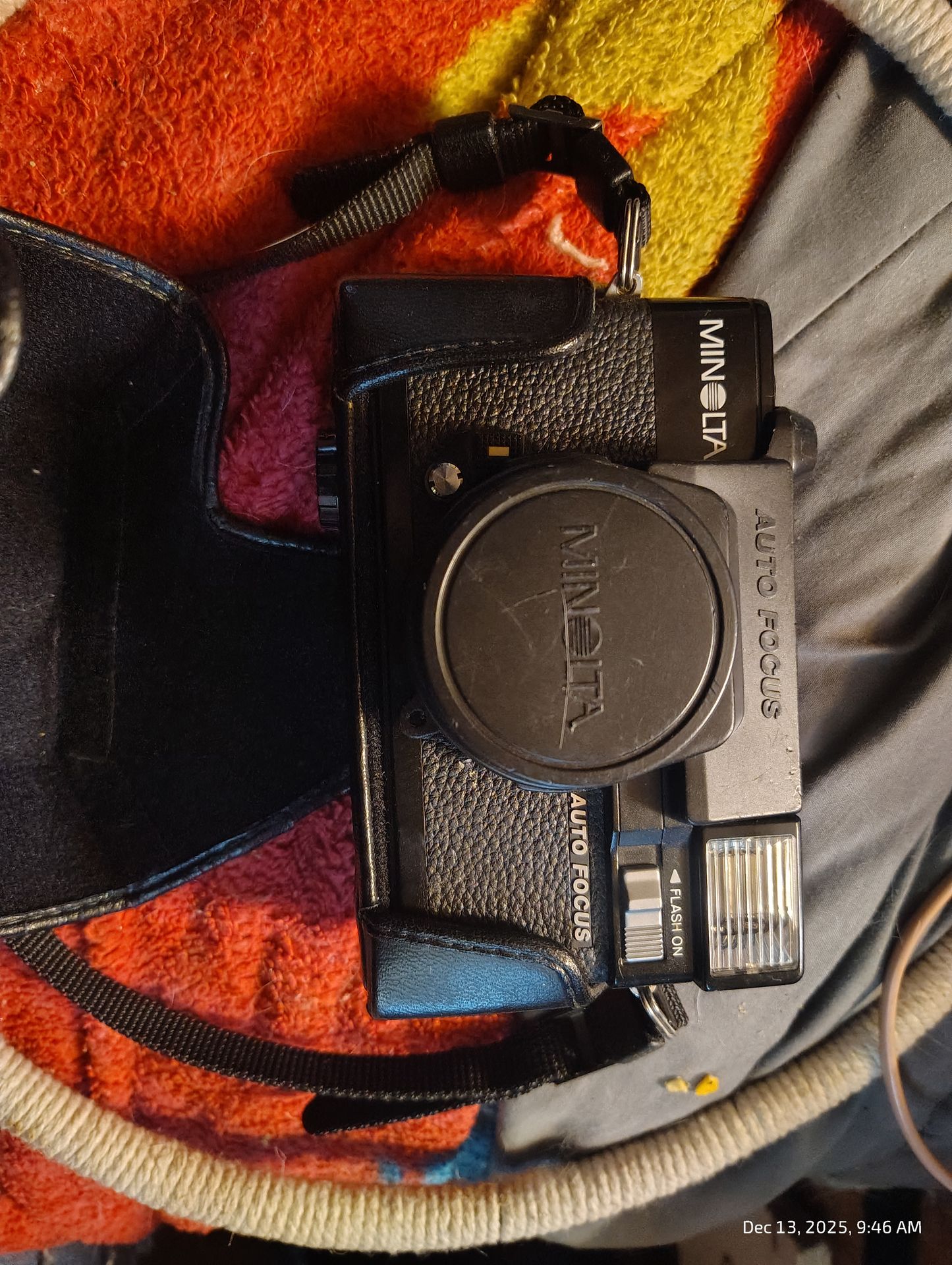 *vintage Minolta Hi-Matic AF2 35mm point-and-shoot film camera. Specs/Facts: Lens: Fixed 38mm f/2.8 lens. Features: Infrared autofocus system and a built-in pop-up flash. Era: Released around 1981, representing one of the first autofocus compact cameras. Status: Considered a collectible vintage item, Used on average are sold for between; $150 to $300