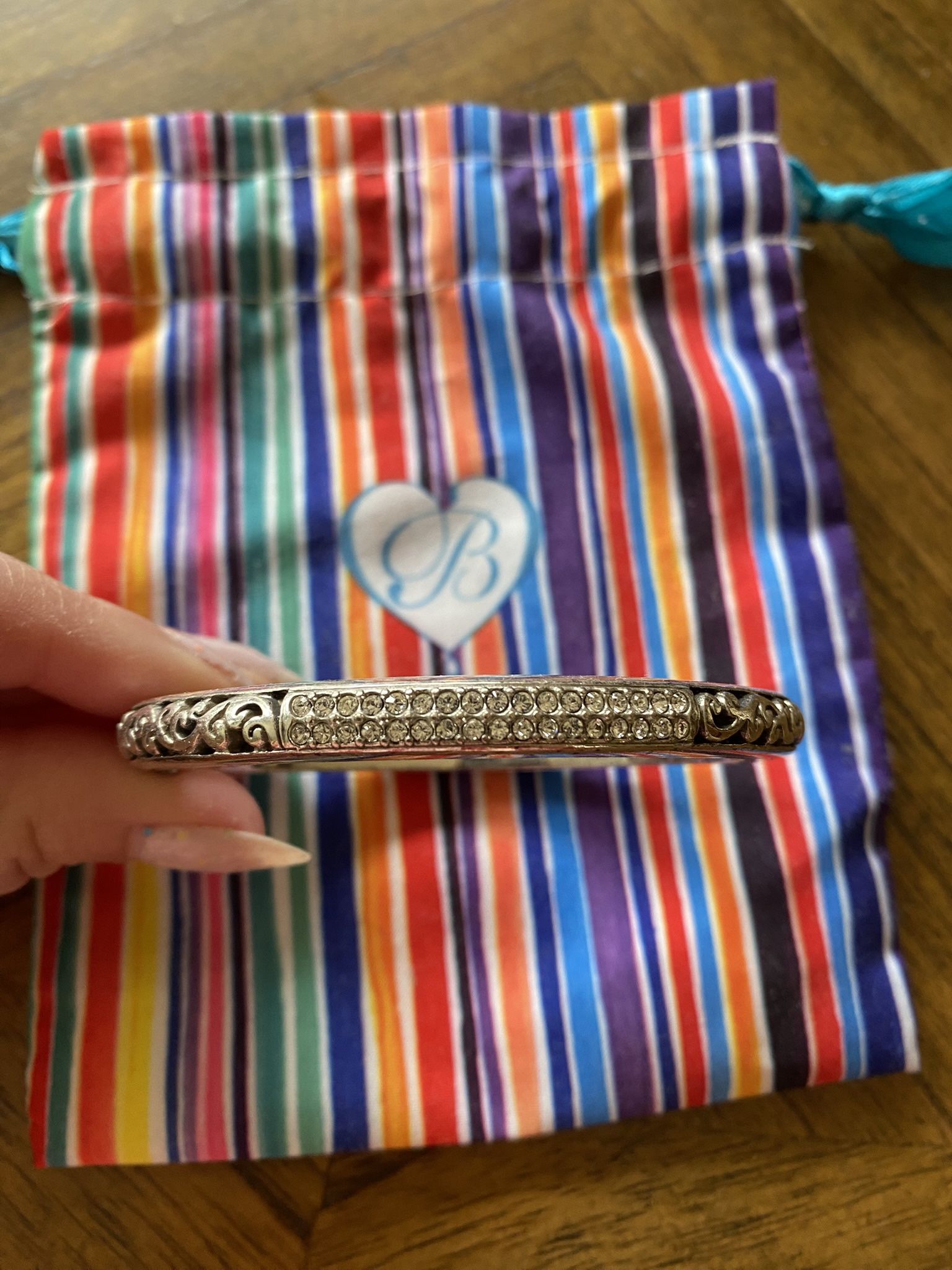 Silver plated Brighton bracelet with crystal details. Hinged bangle with magnetic clasp. Good condition but it has dern some wear. 1/4” width 2 3/4” diameter Originally $60
