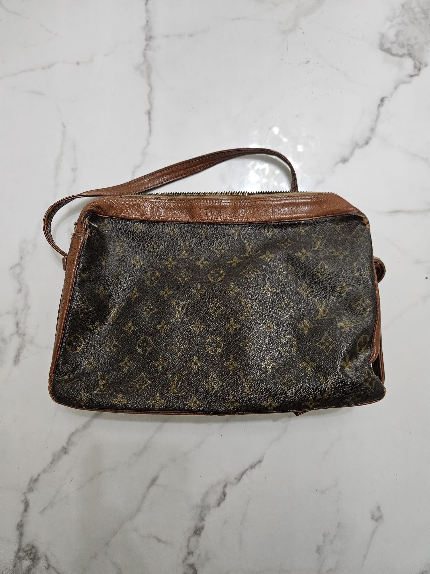 This is a beautiful vintage shoulder bag by Louis Vuitton. Brown leather with the signature brand design along the body of the bag. Small tear along the zipper, as you can see in the first and last pictures. Please message me if you need further information about the condition.