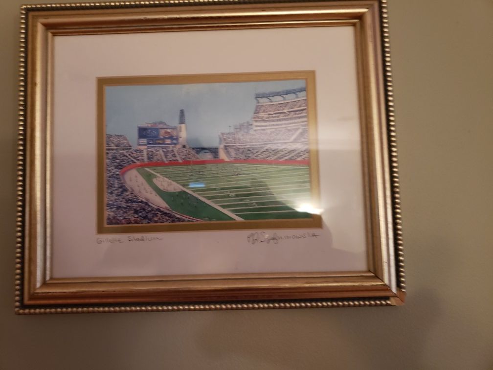 Framed art work )by Pj Szufnarowski,) of Gillette Stadium, double matted, 9.5 x 12 inches. Lower right,frame corner is dinged up.
