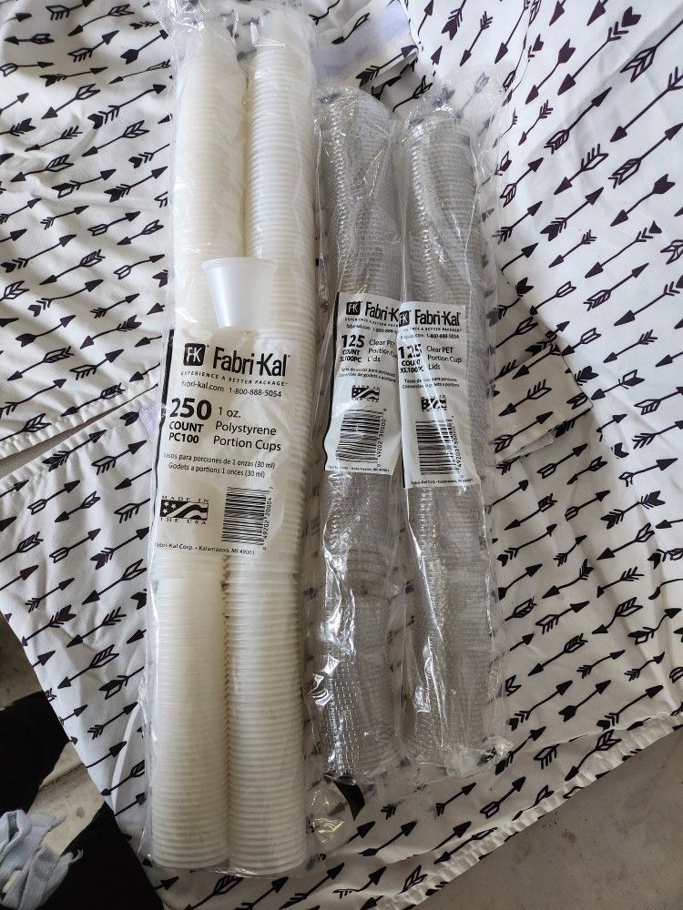 1oz. container cups with lids. 250 cups per bag and 2 bags of 125 lids per bag. I don't deliver.