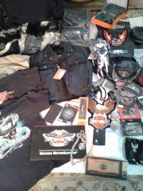 Harley Davidson Clothing and Accessories, $400.00 For All. Well Over $2,000.00 worth of Jackets, Hats, Gloves, Belts, Nives, Patches and Miscellaneous. Most of this Brand New with the Price Tags still on it. The Jacket in the middle has never been worn, with the $375.00 tag still on it. At least 80% of what is pictured is Genuine Harley Davidson. The 2 pairs of leather chaps and a few of the smaller things are not Harley Davidson. And, l have 2 unused Harley Helmets not pictured. I am 6.0' feet tall, 175 lbs. 32" waist and the shirts are Medium to Large. $400.00 for all. Nothing is being sold seperate. I don't have My Phone at work, sometimes it takes a while to answer Your Message.