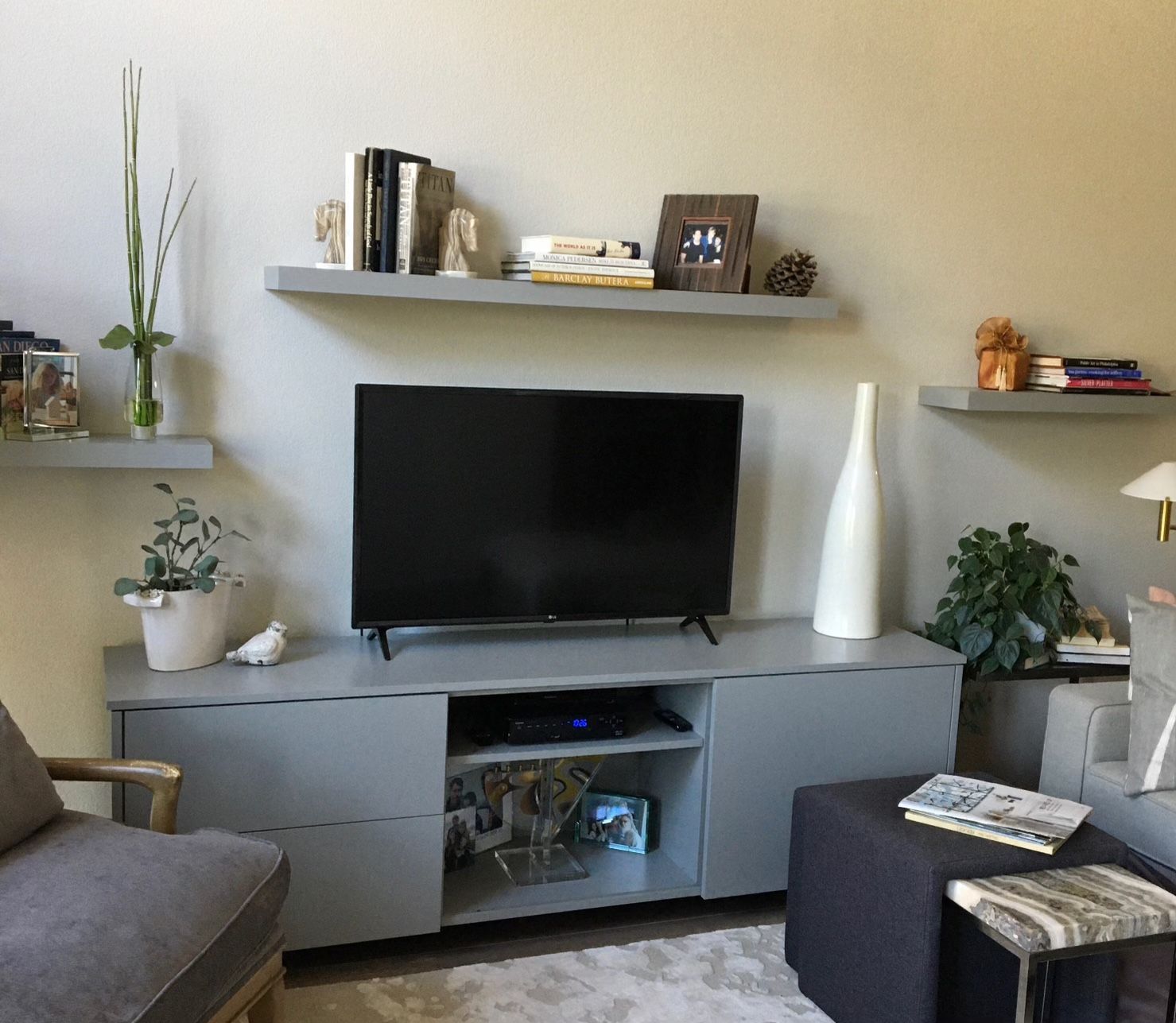 Perfect condition custom media console. I am selling this for my grandmother who paid 4,000 to have it custom made and unfortunately has to downsize. Wood crafted, laminated console with three matching floating shelves.