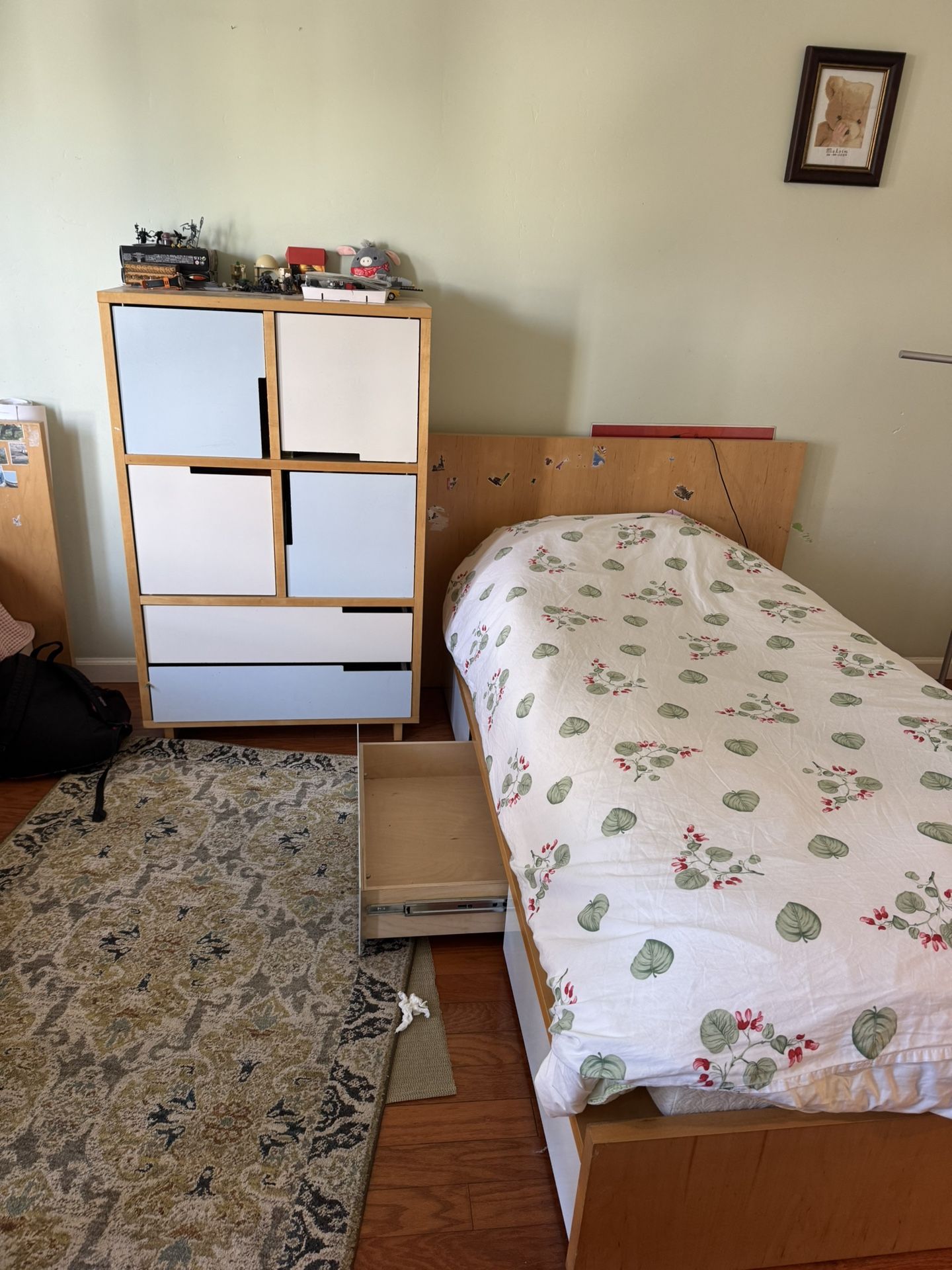 Solid Canadian contemporary furniture that served our family for years and our boys have outgrown this. The beds come together with free memory foam mattresses. Each of the beds has three drawers that can serve as storage for toys. Each item costs75 dollars. They can be sold together or separately