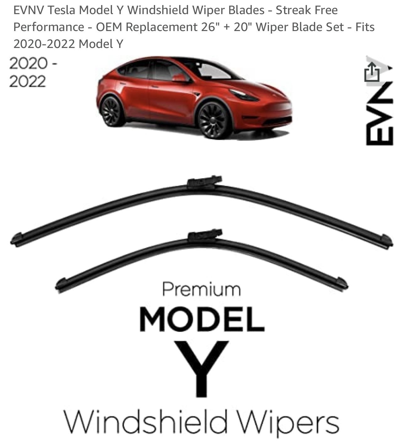 EVNV Tesla Model Y Windshield Wiper Blades - Streak Free Performance - OEM Replacement 26" + 20" Wiper Blade Set - Fits 2020-2022 Model Y