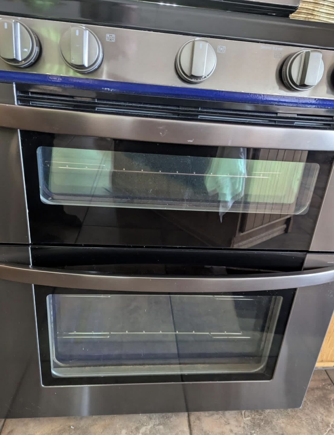 LG Versatile 29.9 inch wide black stainless steel finish gas double oven with broil and a 6.1 cubic feet total oven capacity and a secondary oven with 3.9 cu. ft. capacity. 5 sealed burners on the cooktop with griddle. SuperBoil, and convection heat cooking makes it suitable for larger meals and baking. IntuiTouch controls EasyClean Technology Wide View Window Digital Temperature Display and Timer 12,000 BTU rating for efficient heating. Perfect working condition. Cean like new. LDG3036BD manual. Comes original unused LP