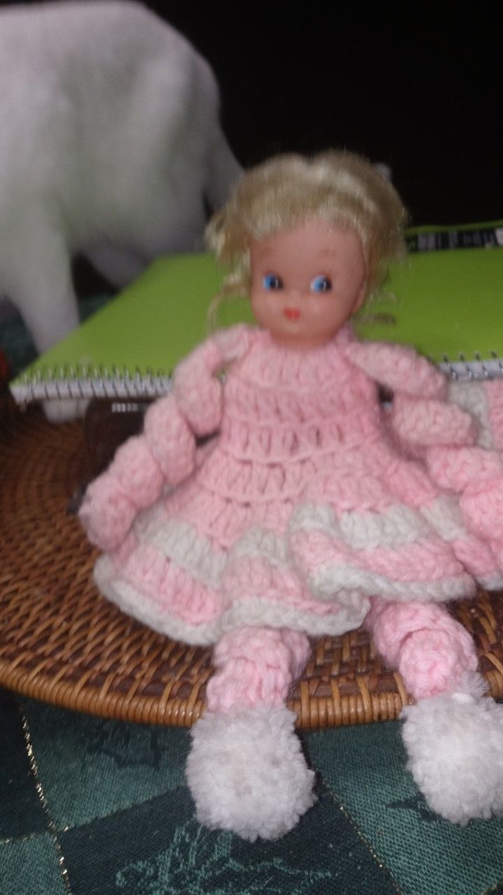 Crocheted 10 Inch Doll Pigtails Blue Eyes Pink Green Yellow Yarn