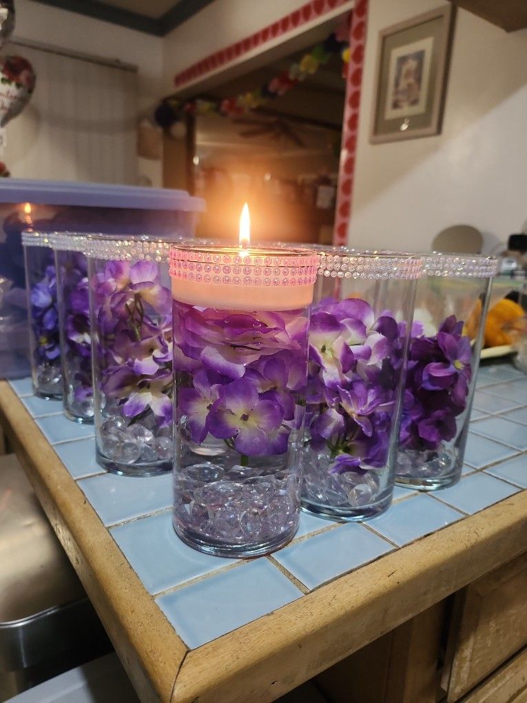 There are 12 in the set. They all have clear crystal jewels at the bottom and artificial flowers. You must add water to use the floating candle. This has been used at a party.