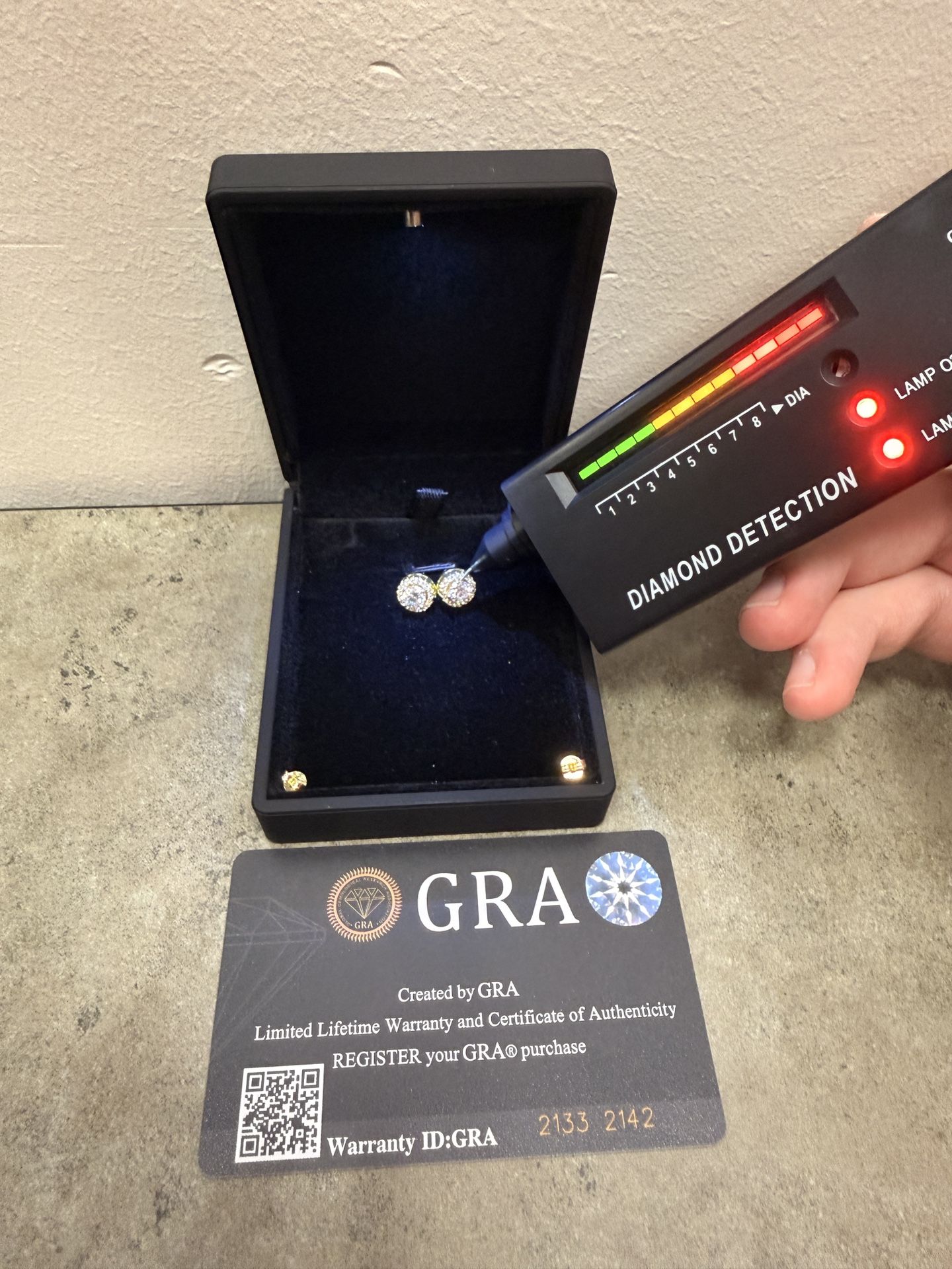 Passes the Diamond tester, shines like crazy, and is beautiful! 925 Silver gold colored frame, with the Moissanite stones polished recently. GRA Certified and comes with documentation. I can ship this, using USPS. Shipping would be free, I’d use my shipping kit, and it would have a tracking number. Please message me with any questions or offers.