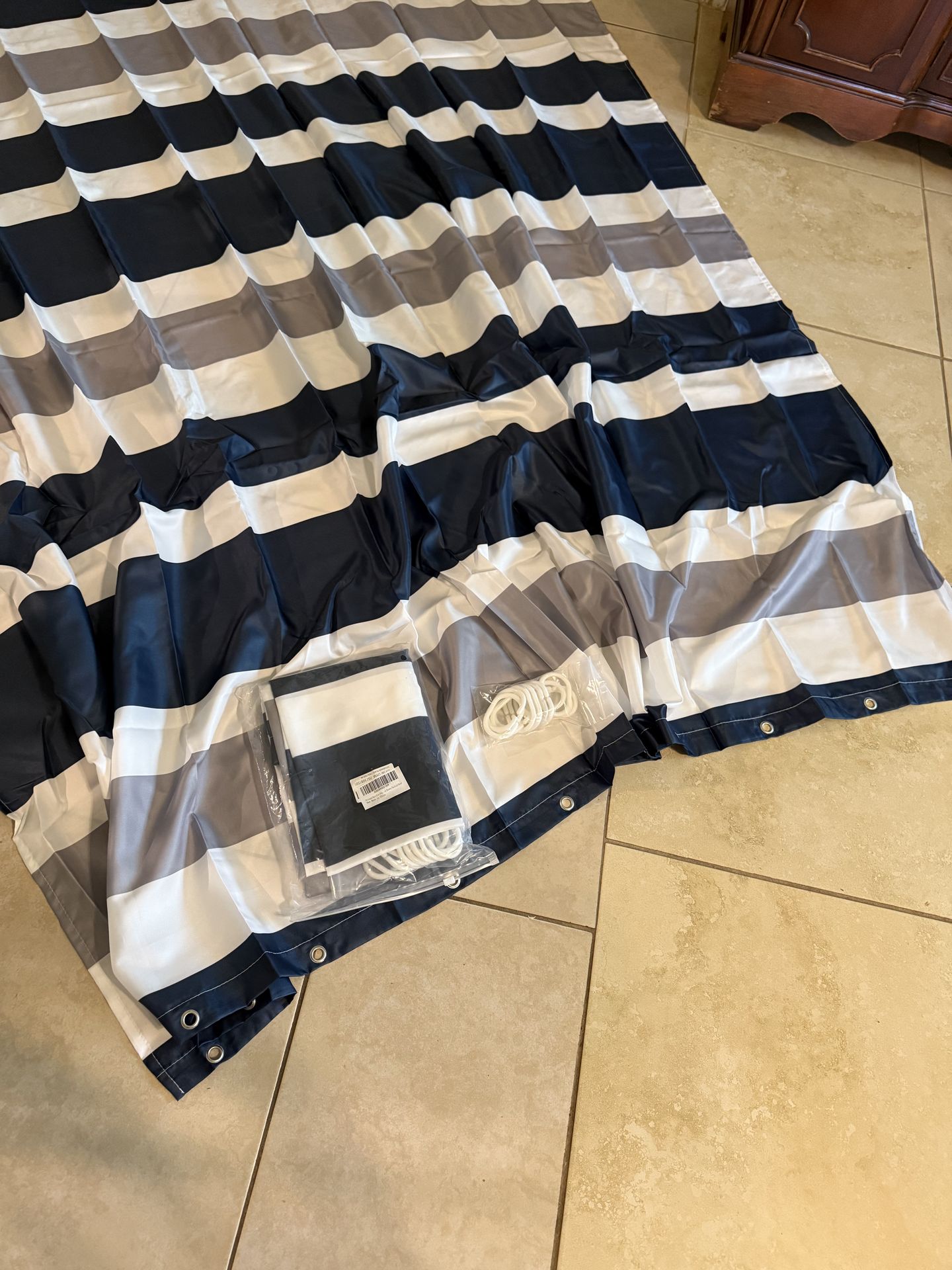 Beautiful shower curtains blue silver and white. Machines washable.