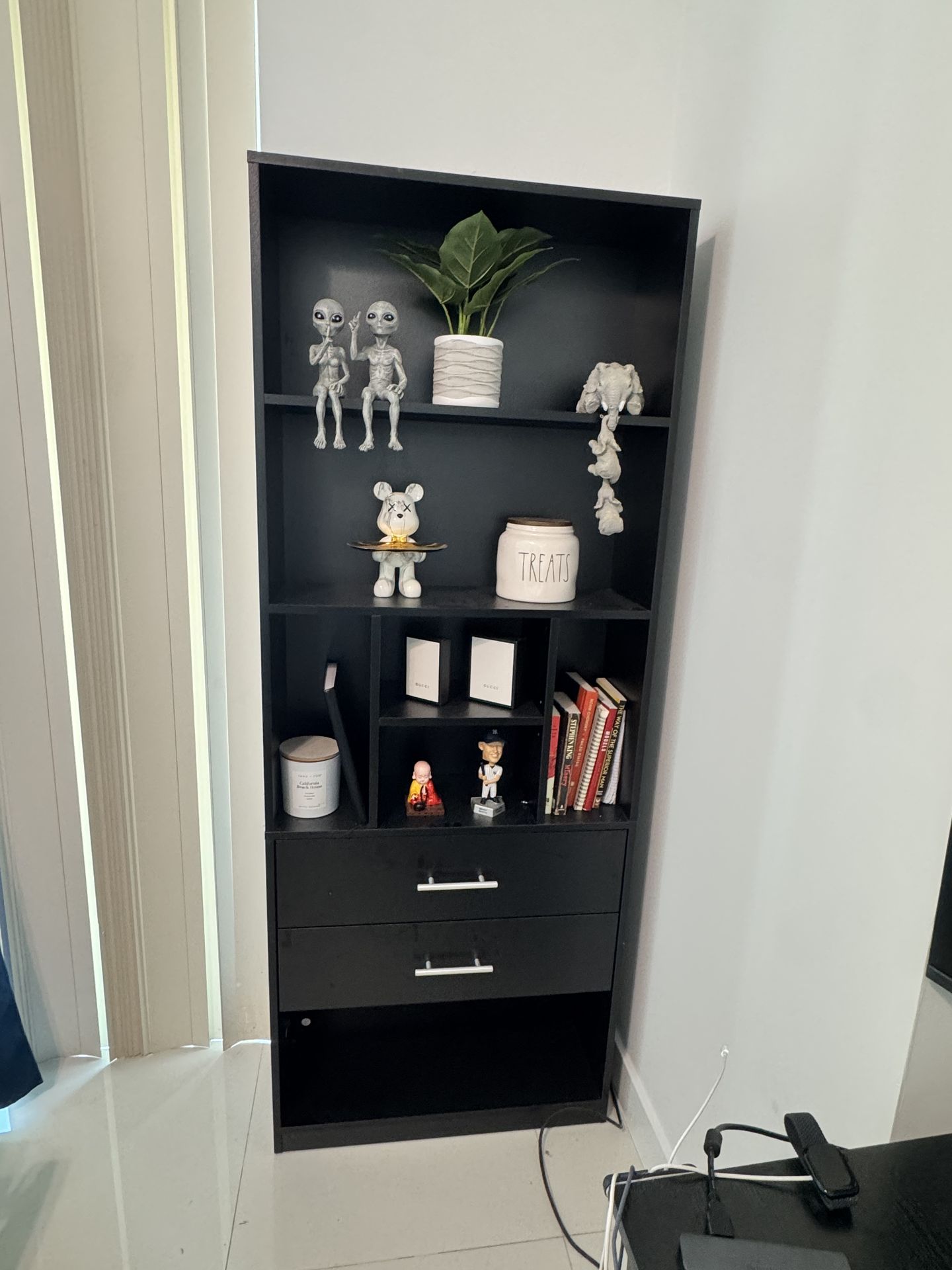 Modern black bookshelf/storage cabinet with multiple shelves and 2 drawers. Great for books, decor, office storage, or bedroom organization. Height: 5 ‘ 10” Length: 3 ‘ 2” Width: 9.5 “ Can drop of Tuesday 3/10 or pick up anytime before 3/11 Features: • Large open shelves • Small cubby storage compartments • Two drawers for additional storage Very sturdy and in good condition.