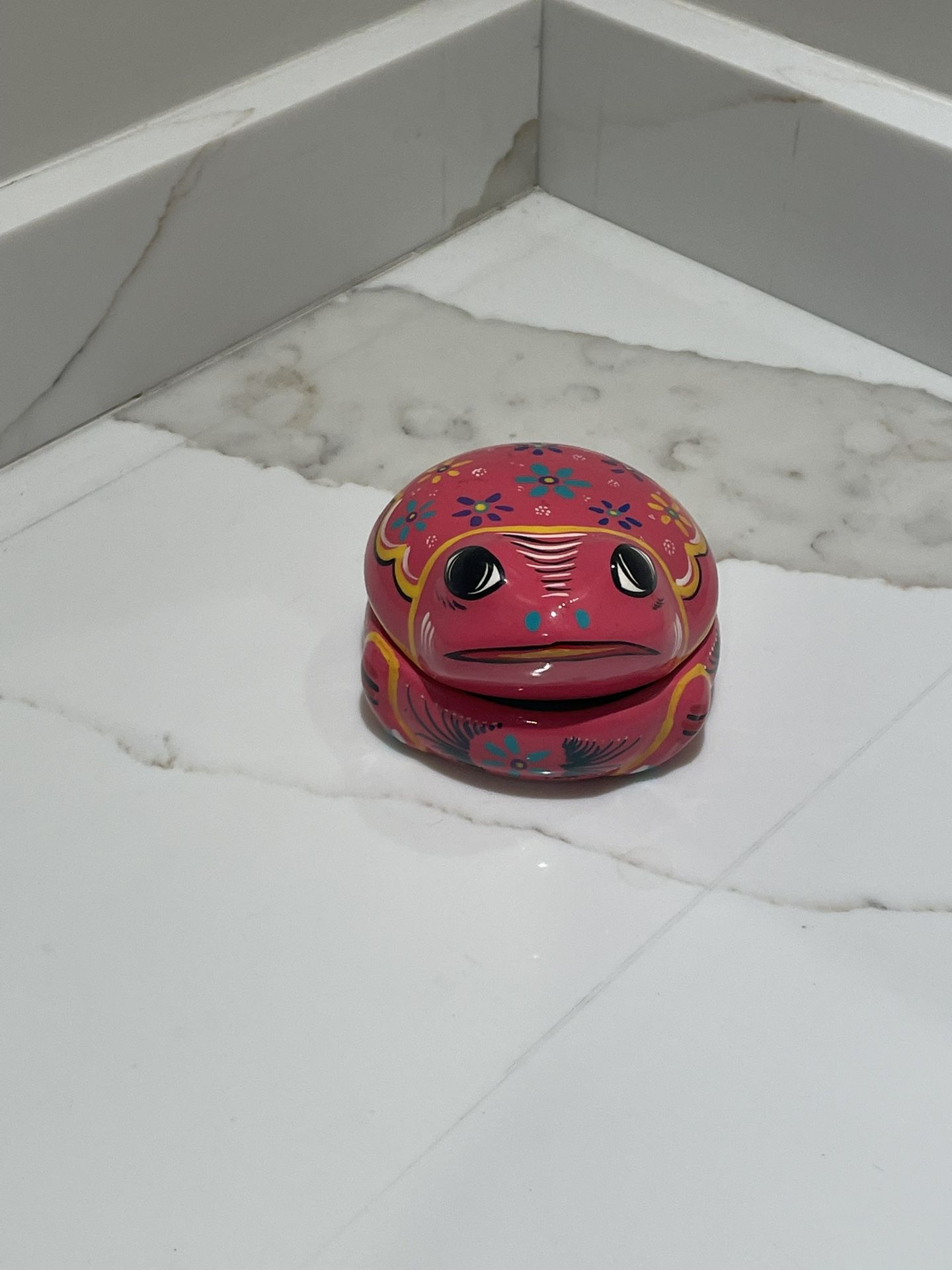 Charming pink frog trinket box with colorful floral designs. Perfect for small treasures.