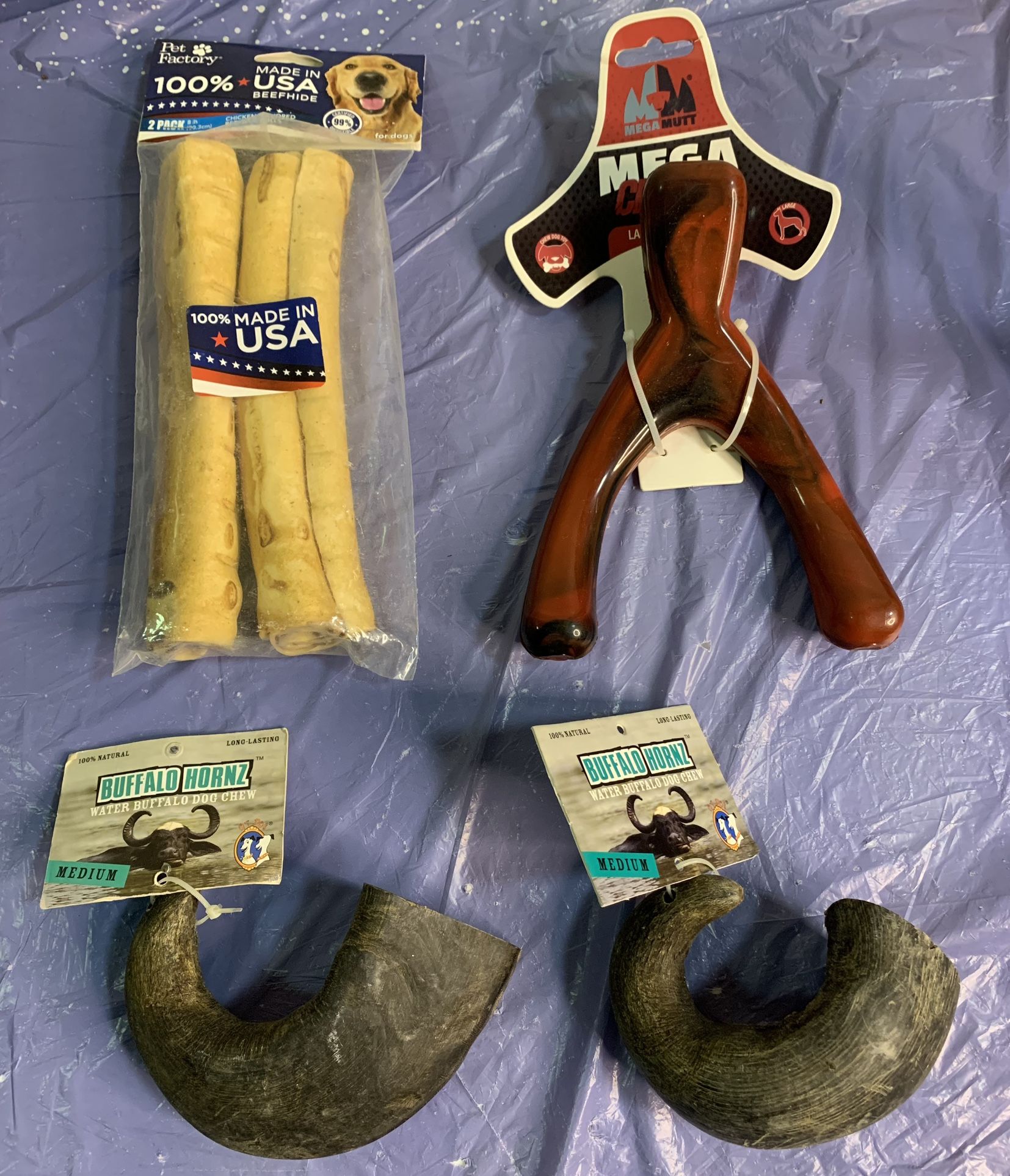 New bundle of dog chew toys for medium and large dogs - 2 beef hide rolls -durable wishbone - two Buffalo horns