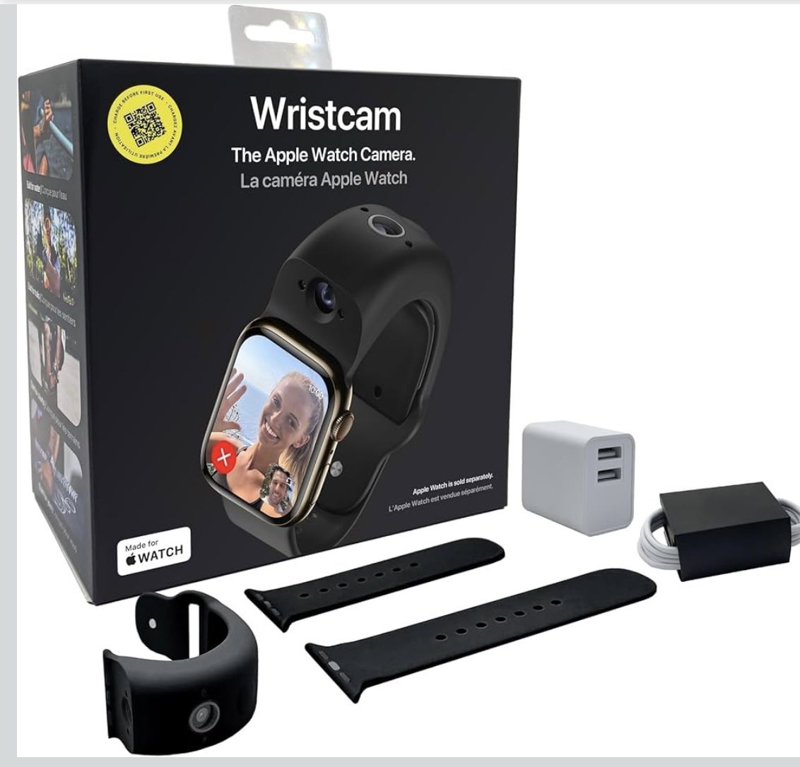 * Apple Watch is sold separately. * Wristcam App required for Video Calling, does not work with FaceTime. * Works with Ultra & Ultra2! * Compatible with watchOS 8 and greater * Not compatible with Apple Watch Family Plan * What's in the box: removable Wristcam core, single color band for Wristcam core with matching short and long bands, Wristcam charging cable and USB wall adapter with 2 slots for ease of connecting the Wristcam and Apple Watch chargers simultaneously. 8MP outward facing camera 2MP self facing camera 8GB of storage memory Battery that will last at least a day for most activities Wifi connectivity, supports both AdHoc connection and connecting to your home/office wifi IPX68 Water resistance Swappable silicon bands snugly house the ultra-light Wristcam module (weighs only 23 grams)