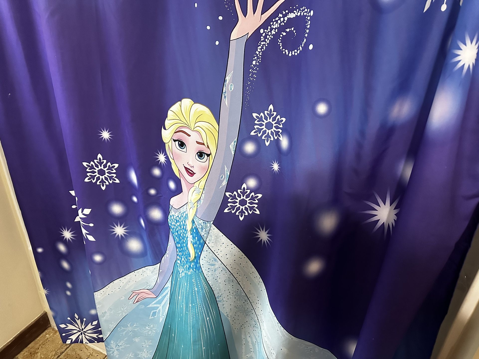 Frozen shower curtain with water proof liner and rug set, contour, lid cover and mat. From pet free/smoke free and vegetarian house hold.