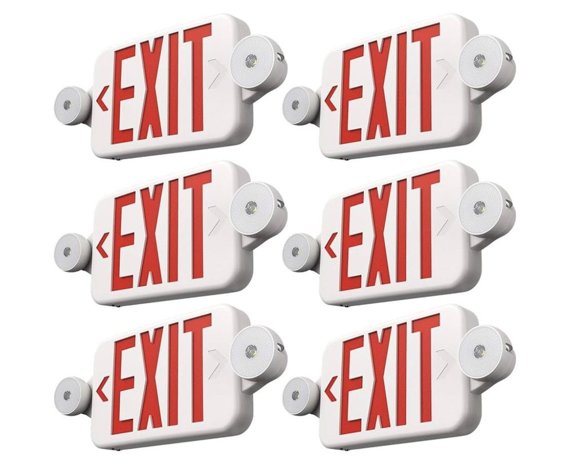New and unused! Still in box see photos FREELICHT 6 Pack Red Exit Signs with Emergency Lights, Two LED Adjustable Head Emergency Exit Light with Battery Backup,Hard Wired,UL Listed, AC 120/277V,Exit Sign Combo for Business D
