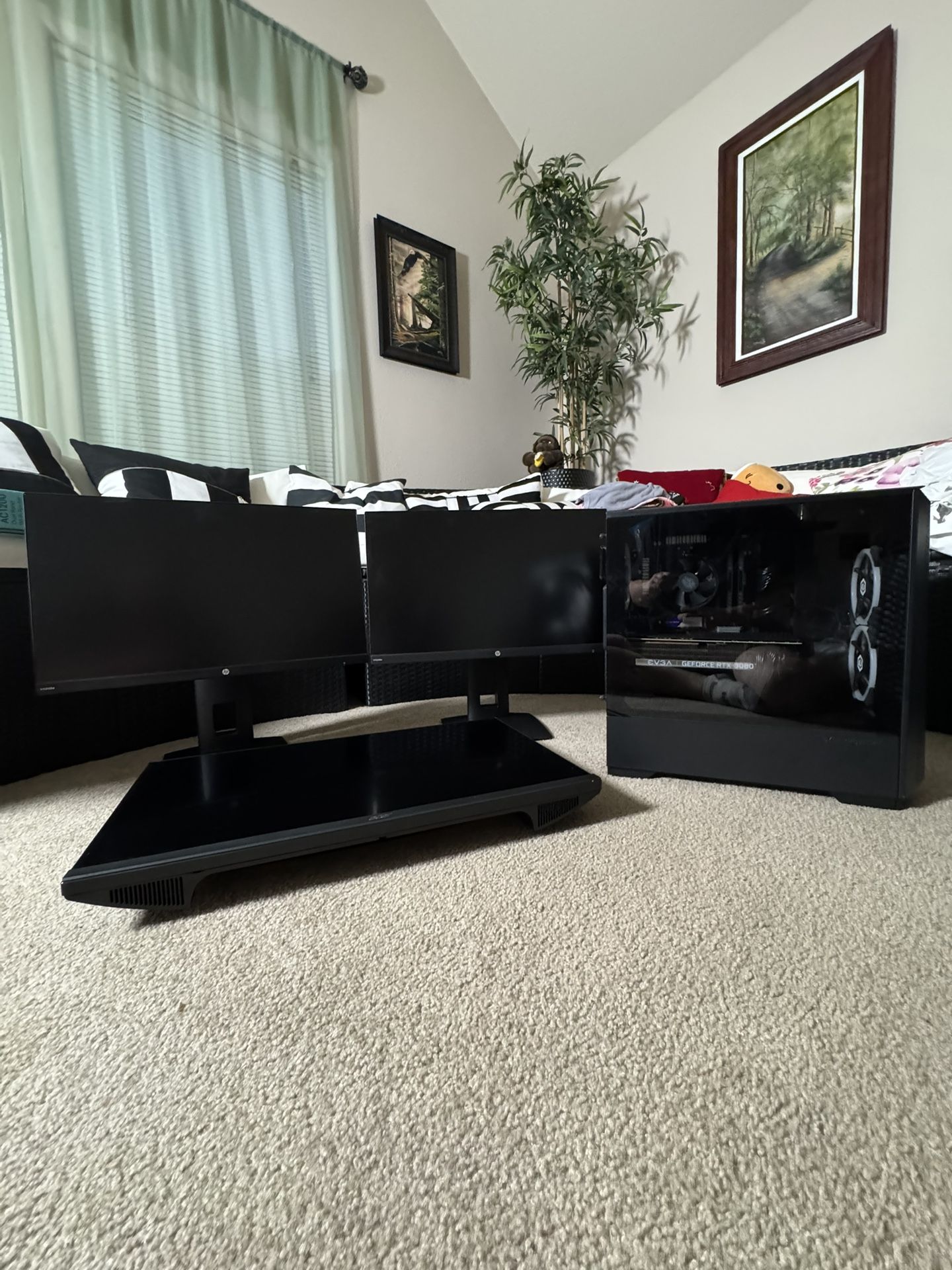 High End Gaming setup including 27 inch 1440p 100hz IPS gaming monitor (doesnt come with stand) and two 24 inch 1080p IPS monitors and the gaming pc. I no longer need it. Whatever your heart desires to do, this setup will be able to do that. Gaming, E-sports, Photo/4K Video editing, Software development, 3D modeling, Engineering, Runnning an instance of artificial intelligence - it can do all of that 1) 27 Inch 1440p IPS 100 hz monitor. Two hdmi ports, displayport and built in speakers π 2) Two 24 inch 1080p IPS monitors 2) Gaming PC π₯οΈ CPU: Ryzen 5 3600 GPU: Evga Rtx 3080 Ti Ultra Ftw3 32 GB 3600mhz DDR4 Corsair Dominator 2 TB Gen 4 NVME SSD 500 GB HDD 500 GB HDD Brand New 850w Super Flower Leadex III Freshly applied Arctic Mx-4 Thermal Paste Freshly installed licensed Windows 11 Home I can install win 10 instead upon a request.
