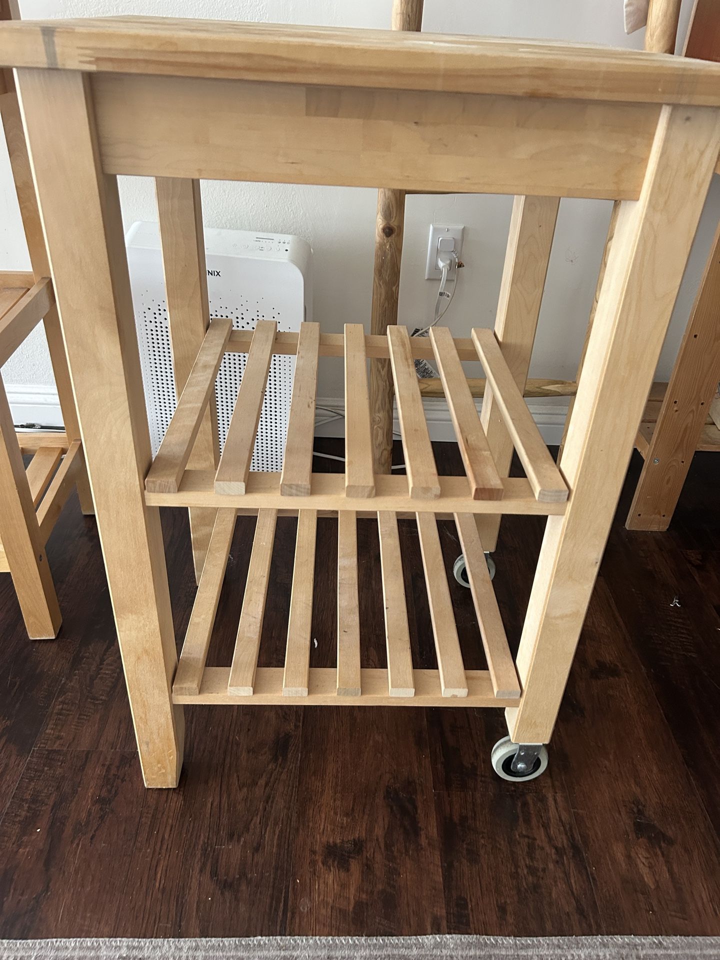 Wooden prep cart and island, both have two wheels that can be used to push them around. $15 for prep cart, Some water staining morning a light sanding wouldn’t fix. $55 for island. Buy together for $60