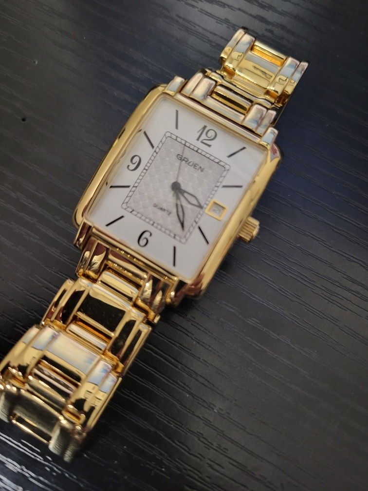 New Old Stock Never Worn - Tells Perfect Time - Box and Papers Included! Bezel Color Gold Closure Hidden Fold Clasp Max Wrist Size 8.26 - 8.5 in Band/Strap Bracelet Vintage Yes Department Men Case back Snap Bezel Type 12-Hour, Diamond Watch Shape Rectangle Style Classic Features 12-Hour Dial, Seconds Hand Case Material Stainless Steel Movement Quartz With Papers Yes With Service Records No Brand Gruen Band Color Gold Band Material Stainless Steel Dial Color Silver Model Gruen Precision With Original Box/Packaging Yes Theme Vintage Case Finish Gloss With Manual/Booklet No Display Analog