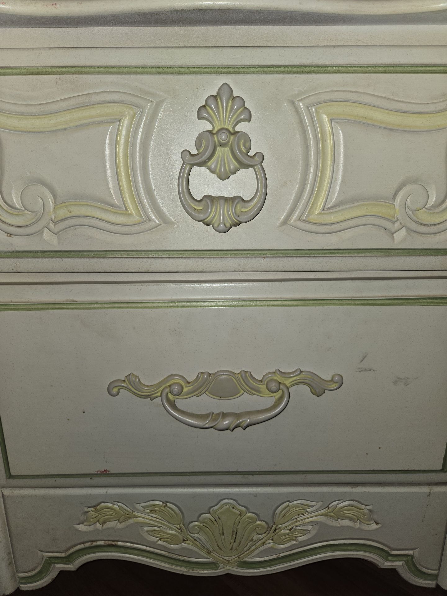 Painted wood, detailed, and metal knobs. About 24x24x15 inches.