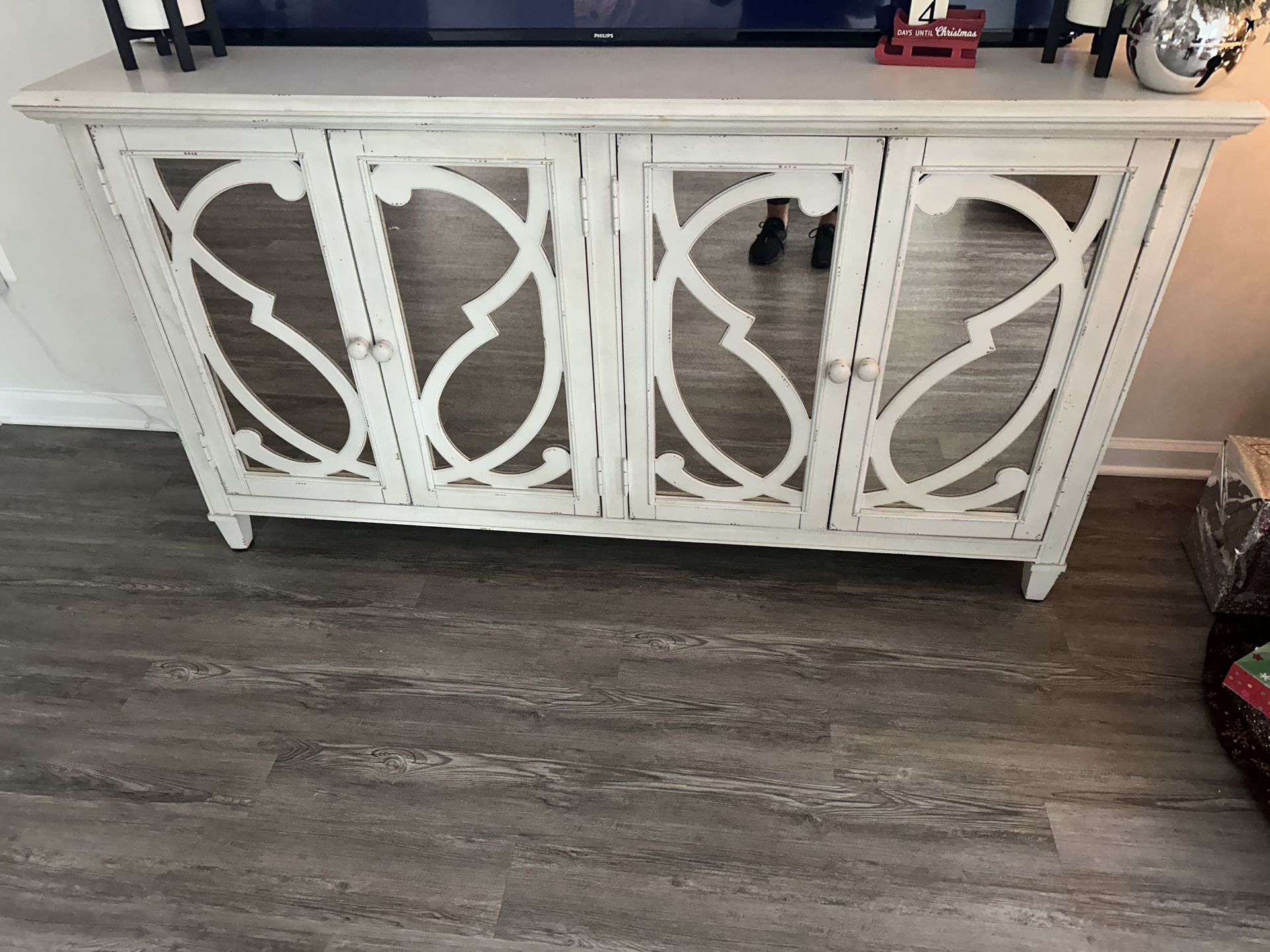 Ashley Signature Design, Vintage Accent Cabinet or TV Stand, Light Gray. Has 4 drawers for storage. $550 obo. No issues. Pickup only. Moving and must go.