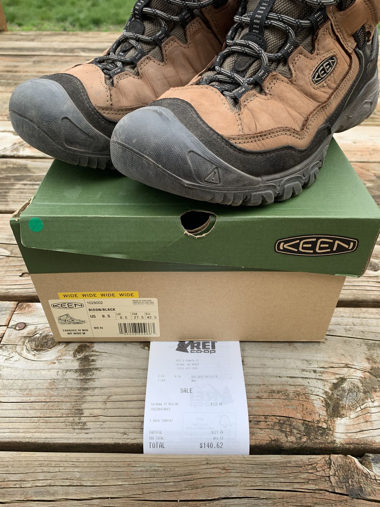Pair of Keen Targhee IV hiking boots in bison/black colorway. Men’s size 9.5 Wide. Excellent condition. I bought them new August 2024 from REI and they have 30 miles of hiking in them. Selling them because they’re half a size too big and just found the exact same boot in the right size (9) at REI’s annual garage sale.
