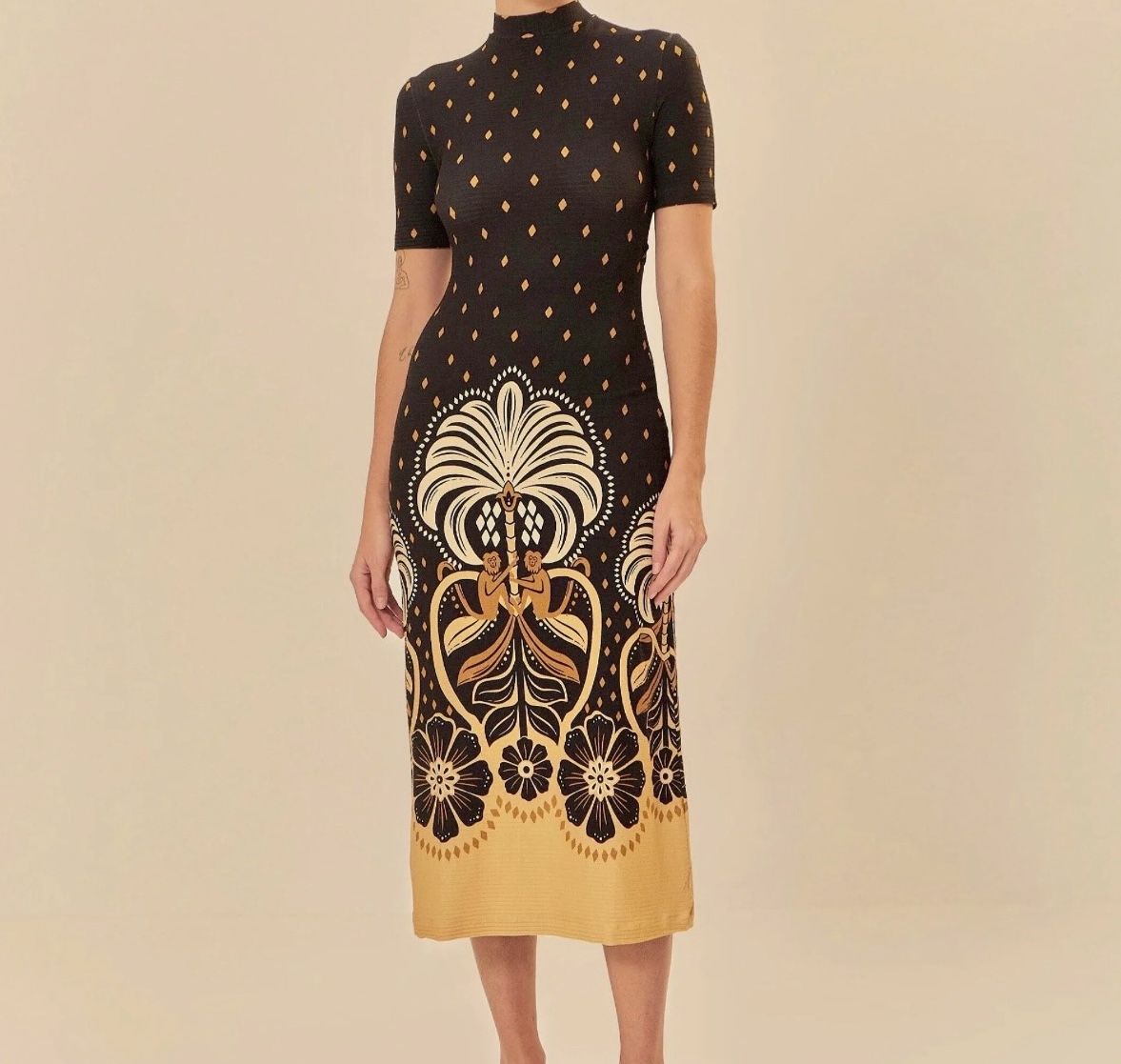 Midi Esplendor Product Details FARM Midi Dress – Esplendor Tropical Black • Fit: Slim fit • Neckline: High neck • Sleeve: Short sleeves • Length: Midi • Print: Full print (all-over pattern) • Style: Fashion Never used Size medium