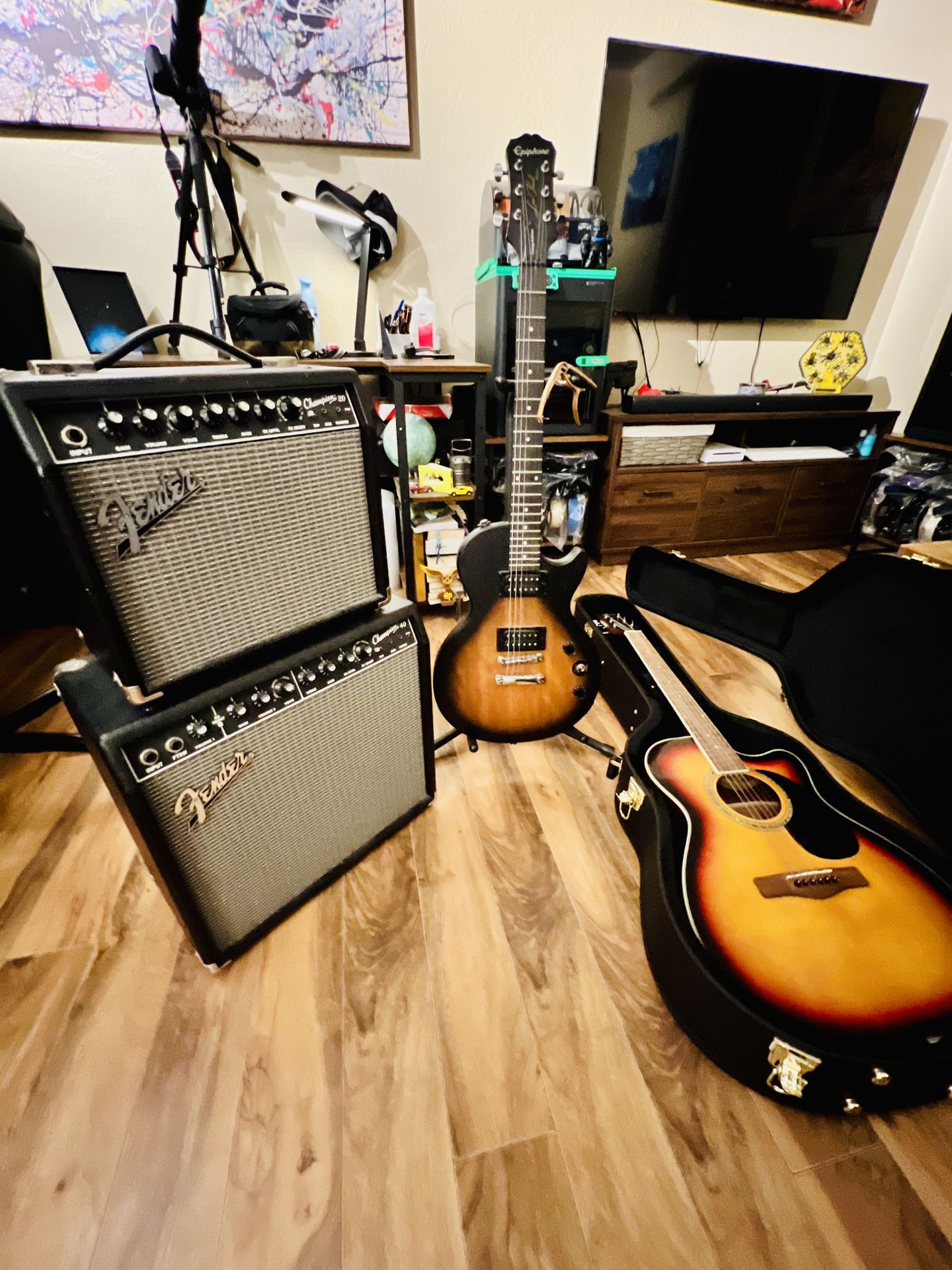 I have a Mitchell Concert acoustic electric 0120CESB, a Epiphone Les Paul Vintage Edition, and two amps the Fender champion 20 and 40. I no longer play really and need the space. Make me some good offers and I will part with them. All items were purchased at guitar center and have never left my home. Thanks for looking!