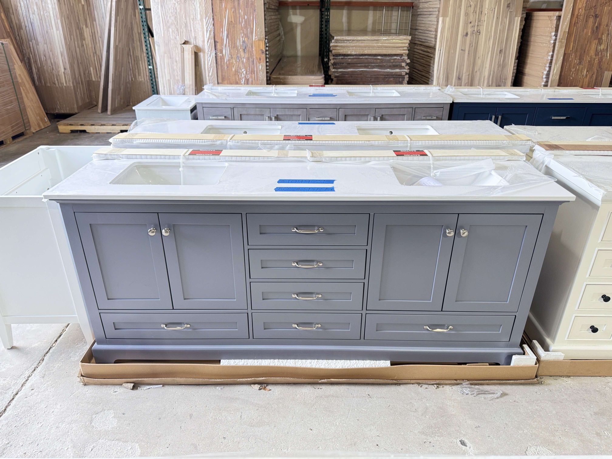 80” bathroom vanity in Grey, double sink, soft close and solid wood. 6 drawers, 4 Doors and modern handles with marble top in White $999
