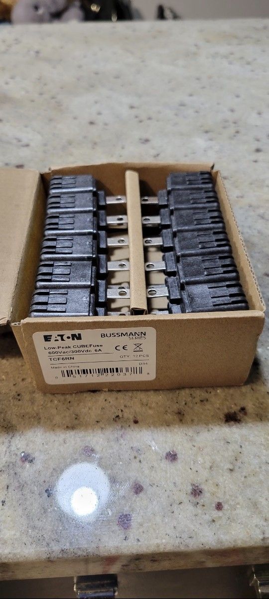 Eaton Low Peak Cube Fuses 600VAC/300Vdc . Eaton website for 12 fuses is 690.36 this is extremely discounted 6A TCF6RN CUBEFUSE 6AMP 600VAC NON-INDICATING TIME DELAY PLUG IN TYPE-D