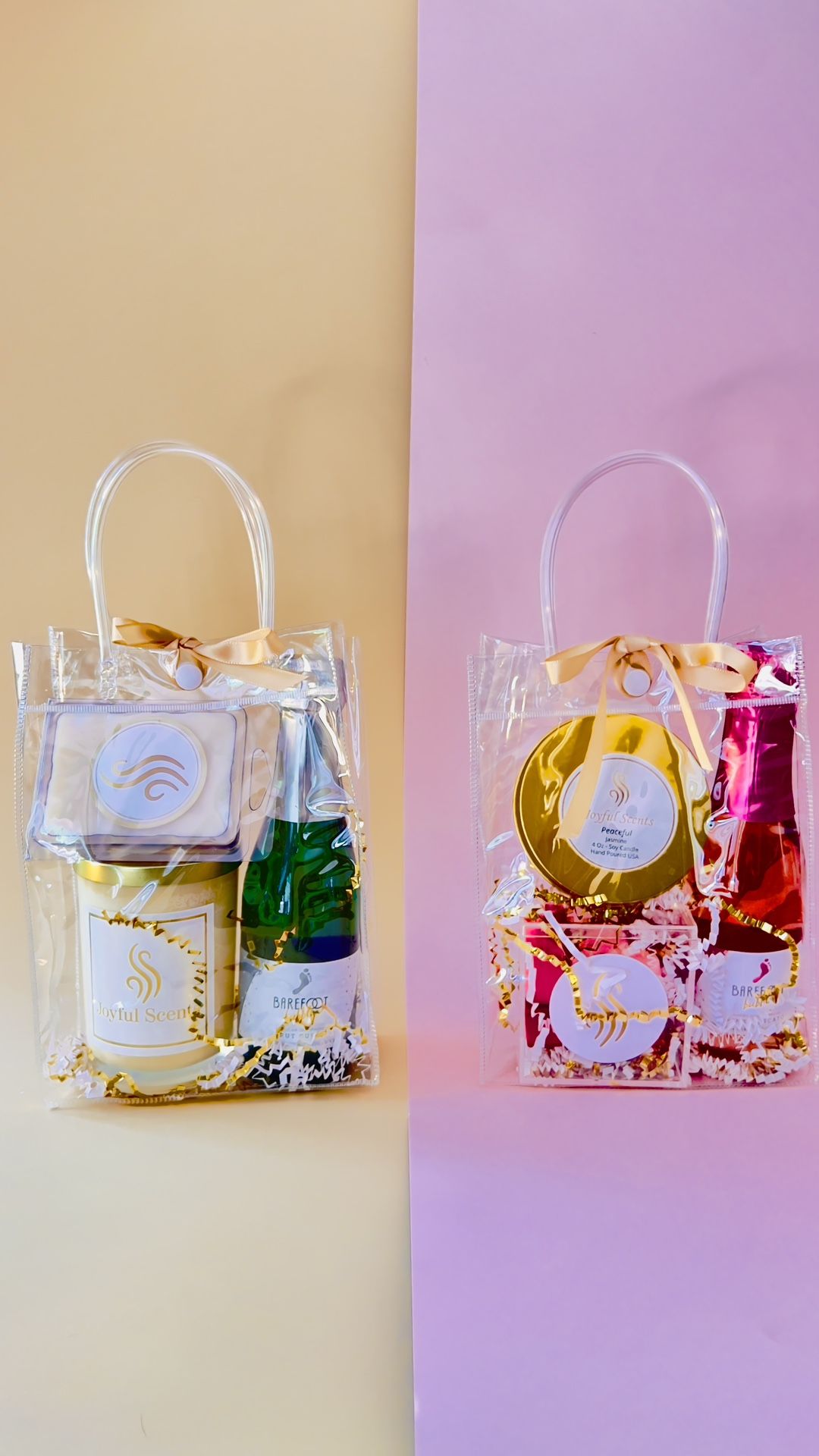 Celebrate any occasion we our beautiful Candles Gift. Great Idea for Mother's Day. The gift bag includes 7 oz Scented Soy Candles, 2 oz candles tin or Wax Melts Package, or Heart Wax Melts in an acrylic clear box, and 6 oz Mini Sparkling drink in a nice multi-use clear bag with a gold ribbon.