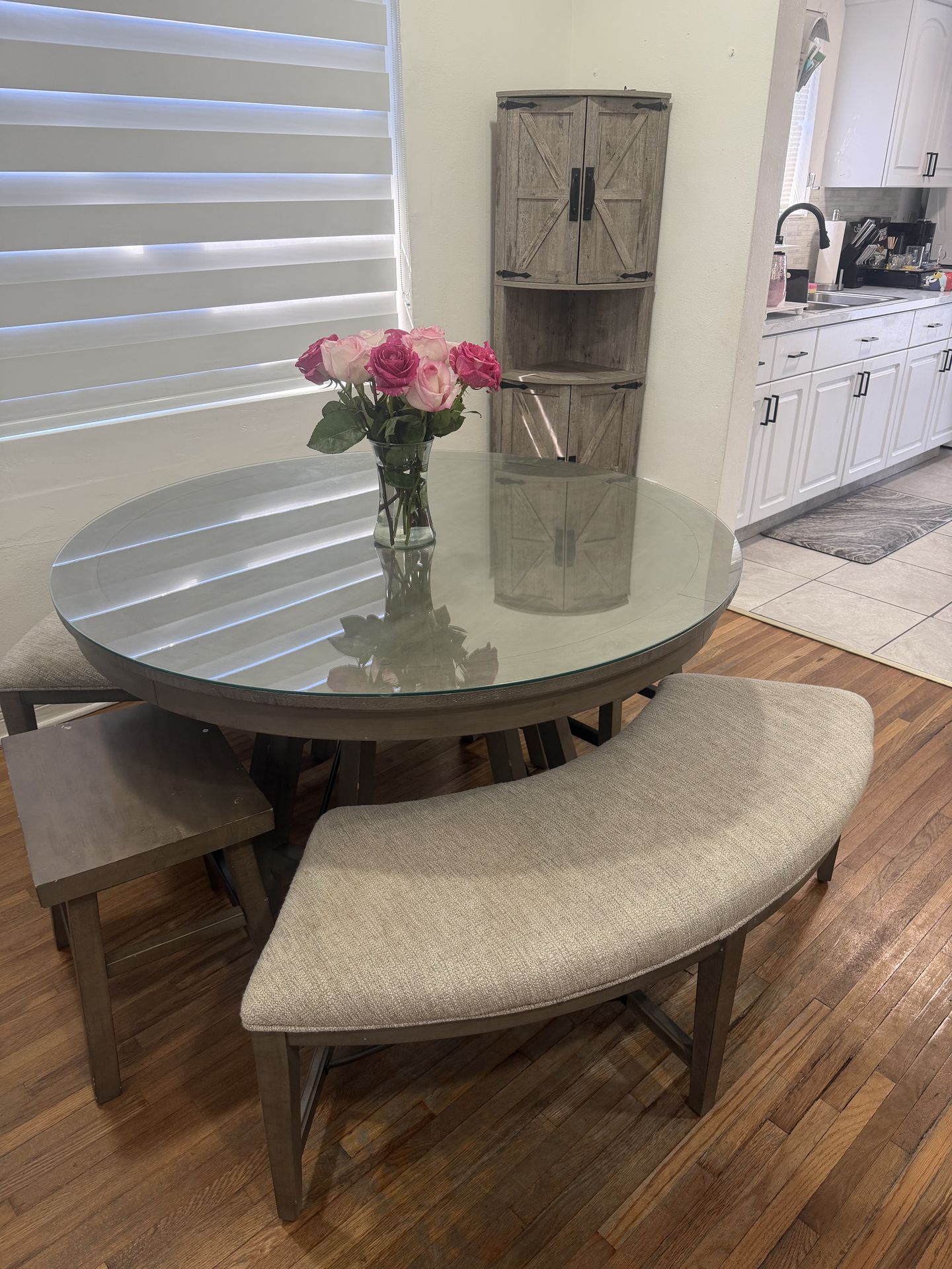 El juego de comer es de madera buena con cristal arriba y puede ser hasta para 6 personas.estante hermoso a juego