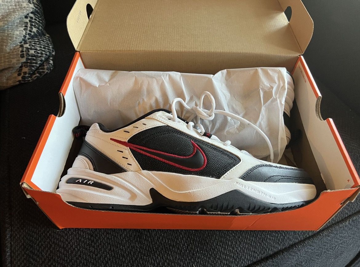 This is a Nike Air Monarch IV training shoe in a white, black, and red colorway. The shoe features a leather upper for durability, a lightweight Phylon midsole, and a full-length encapsulated Air-Sole unit for cushioning. The solid rubber outsole has an aggressive traction pattern and flex grooves for natural movement and traction on various surfaces.