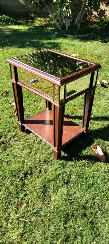 Bureau / Side Table / Corner Table / Night stand Made from wood. With top and side reflective glass mirrors. Overall good shape. Paint on top has pealed off. Height: 29 inches Width: 22 inches Depth: 16 inches Yours for $25.00