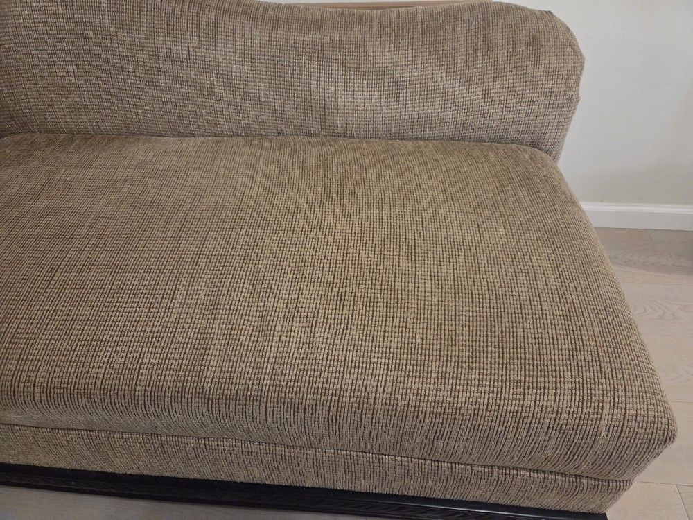 Chaise lounge measures 64 inches long 35 inches wide, 20 inches high. Brown color, wood trim and legs.